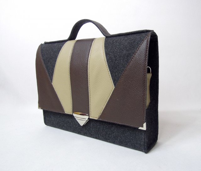 Torebka została wykonana z grubego, mocnego filcu i skóry naturalnej, bydlęcej. Klapę torebki zdobią geometryczne skóry w kolorze brązowym i beżowym. Prosta forma, ciekawie zdobiona. Długość torebki - około 33 cm, wysokość około 27 cm, głębokość 7,5 cm. Torebka została wykonana z dbałością o każdy szczegół - klapa zapinana jest na eleganckie zapięcie w kolorze srebrnym. Wewnątrz torebki znajdują się 2 kieszonki - na telefon, a druga na inne drobne przedmioty. Pod klapą znajduje się spora kieszonka na suwak. Do torebki dołączony jest odpinany, wzmocniony, filcowy pasek z regulacją długości. Teczka mieści format A4, ale nie jest od niego dużo większa. Ostatnie zdjęcie przedstawia torebkę tej wielkości na manekinie. Torebka świetnie sprawdzi się jako torba na laptopa 13' lub torba na dokumenty. Gorąco polecam!