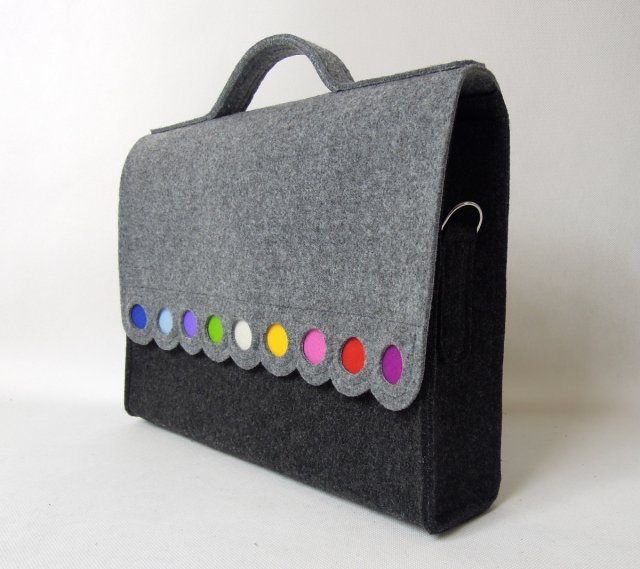 Torebka została wykonana z grubego, mocnego filcu. Klapa torebki jest w kolorze szarym, natomiast przód, boki i tył torebki jest w kolorze grafitowym. Prosta forma, ciekawie zdobiona. Bardzo energetyczna i kolorowa! Długość torebki - około 33 cm, wysokość około 27 cm, głębokość 7,5 cm. Torebka została wykonana z dbałością o każdy szczegół - klapa zapinana jest na 2 magnesy, w środku znajdują się 2 kieszonki - na telefon, a druga na inne drobne przedmioty. Pod klapą znajduje się spora kieszonka na suwak. Do torebki dołączony jest odpinany, wzmocniony, filcowy pasek z regulacją długości. Teczka mieści format A4, ale nie jest od niego dużo większa. Torebka świetnie sprawdzi się jako torba na laptopa 13" lub torba na dokumenty.