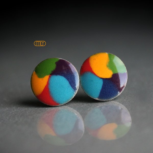 Okrągłe, lekko nieregularne ceramiczne kolczyki w formie sztyftów, ręcznie wykonane z delikatnej gliny kamionkowej, jednostronnie szkliwione kolorowym szkliwem z efektem plamek, na sztyftach w kolorze srebrnym. Średnica ok. 11mm.Polecam