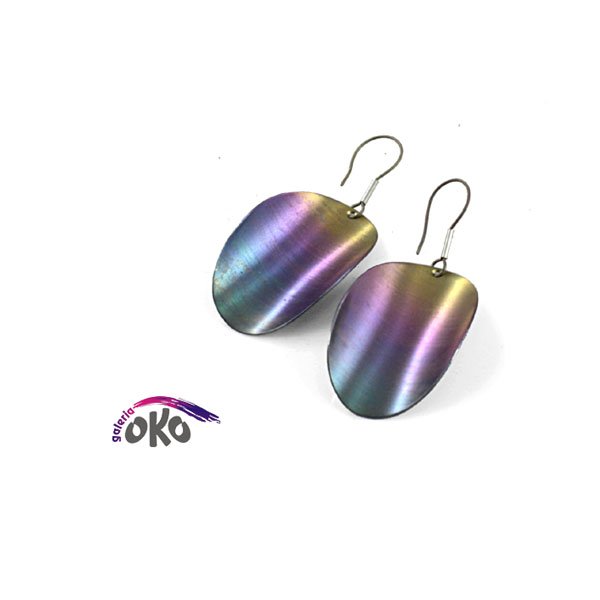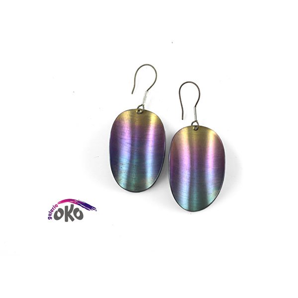 Kolczyki w całości wykonane z tytanu w odcieniach złota niebieskiego i fioletu. Listki kształtowane ręcznie, grawerowane i satynowane. Niezwykle lekkie i hipoalergiczne. Na odwrocie sygnowane wygrawerowanym autografem.Długość z tytanowymi zawieszkami 6 cm a owal ma wymiary 4,2 cm na 2,7 cm.Tytan jest niezwykle lekkim i trwałym metalem który nie wywołuje żadnych alergii-jest hipoalergiczny-stosowany w chirurgii i stomatologii. Odporny na działanie chemikaliów.