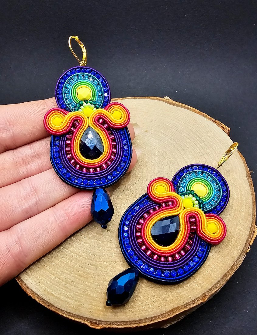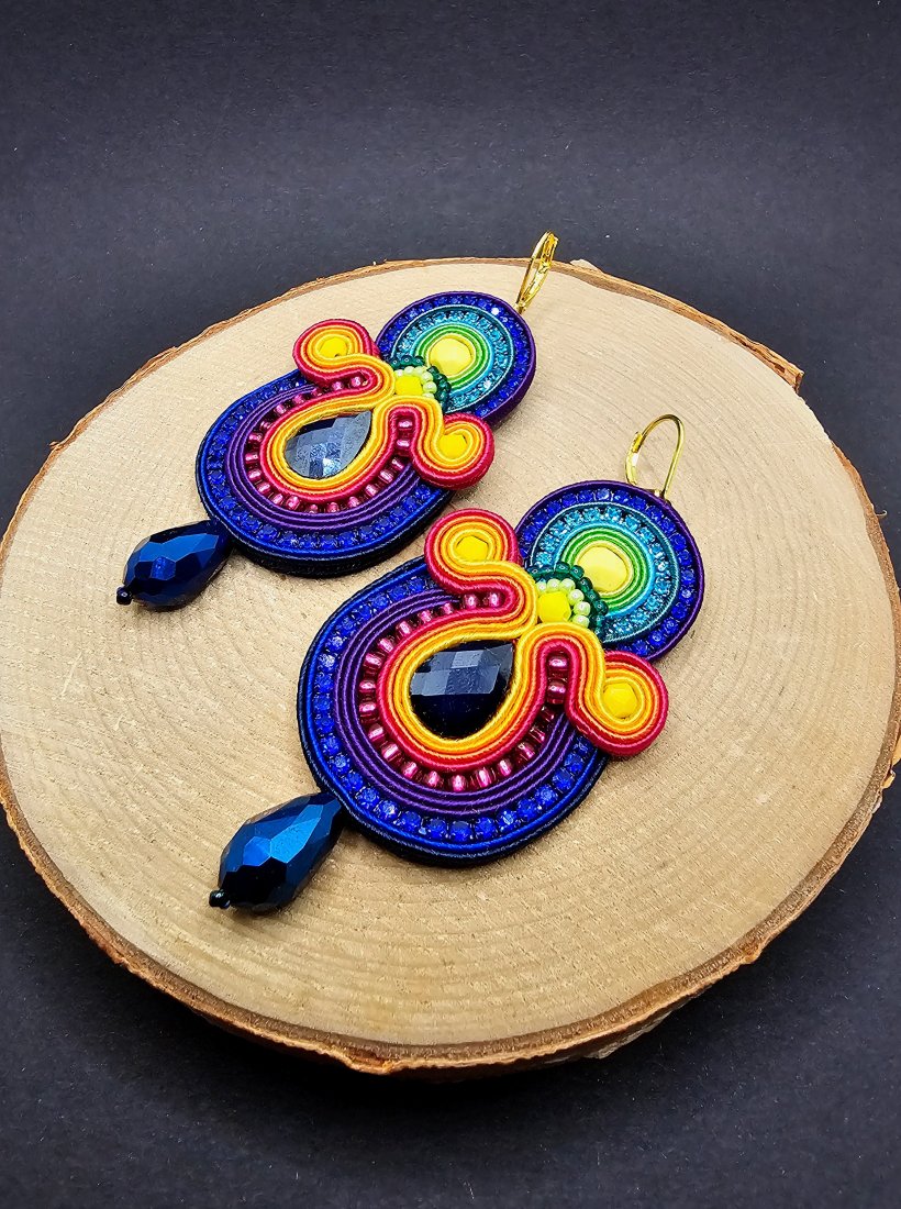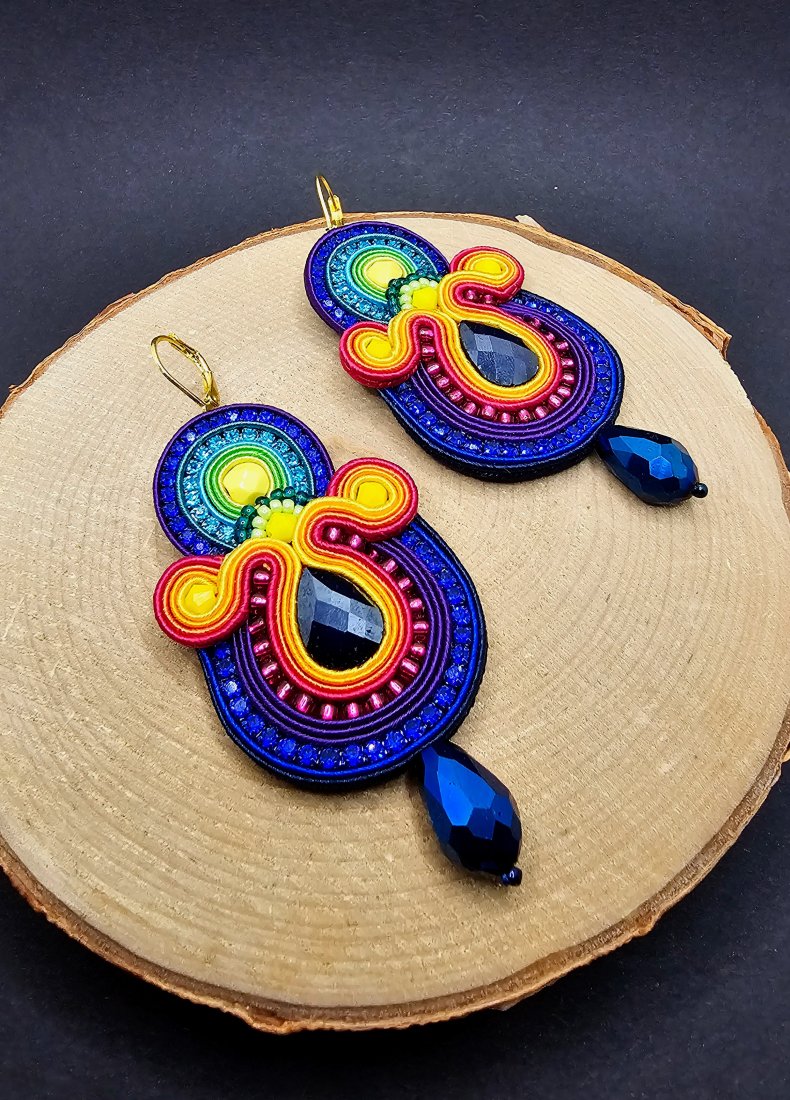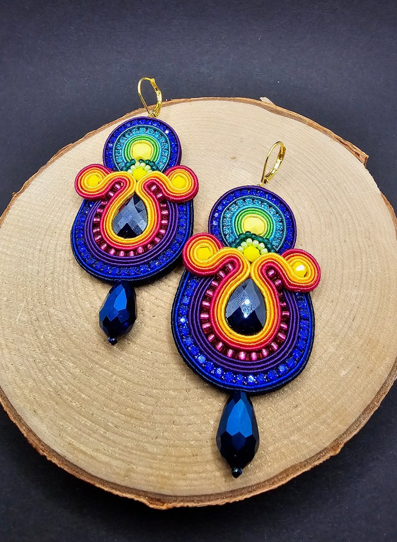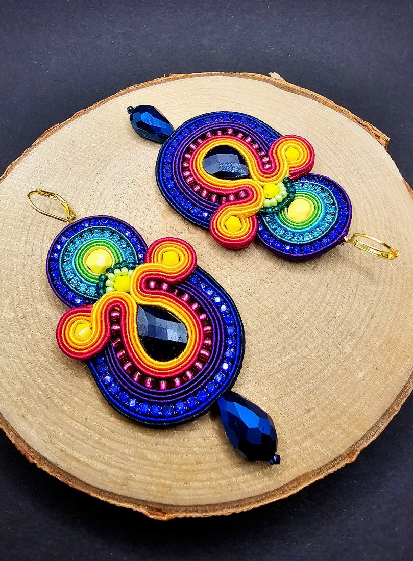 Szklane fasetowane kryształki otoczone sznurkami sutasz, mieniącą się taśmą z cyrkoniami oraz szklanymi czeskimi i japońskimi koralikami o rożnych kształtach i wielkościach. Dół kolczyków zdobią kryształki w kształcie łezki. Kolory w kolczykach: granatowy, różowy, fioletowy, pomarańczowy, żółty, zielony, turkusowy. Kolczyki zawieszone na biglach angielskich w kolorze złotym.