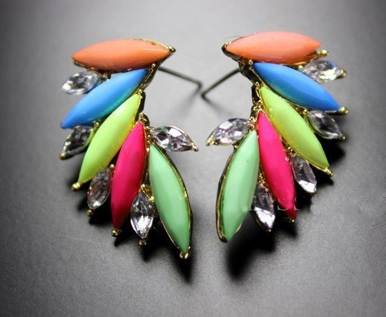 Urocze kolorowe kolczyki na sztyftach. Wykonane z akrylu, cyrkonii i metalu w kolorze złota. Wygodne silikonowe zatyczki.