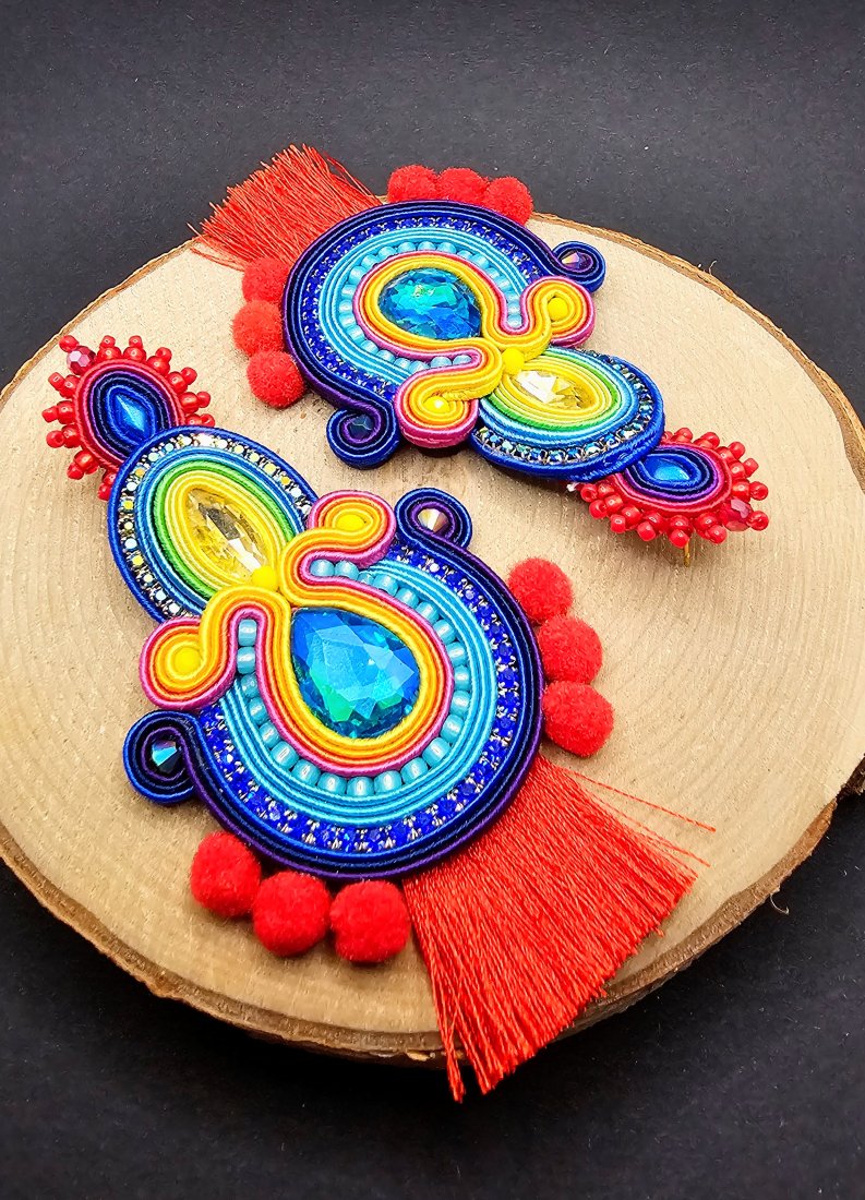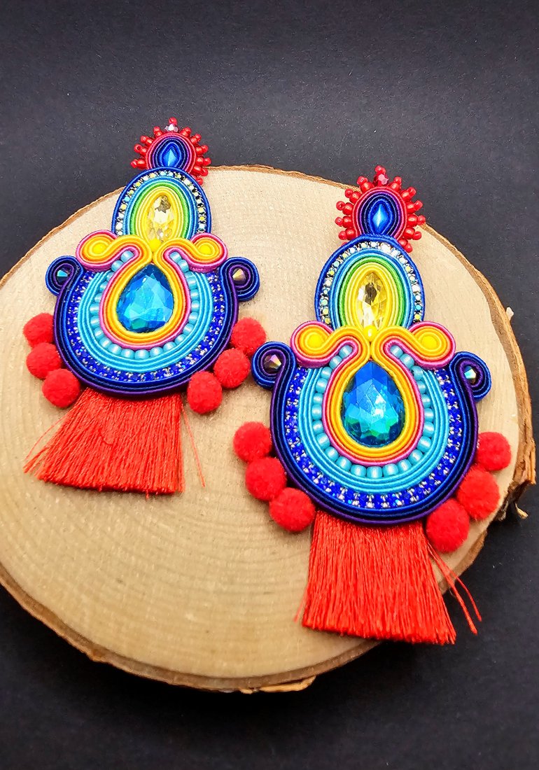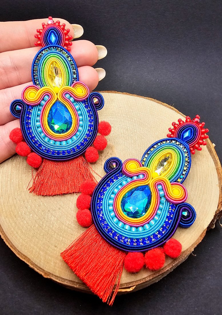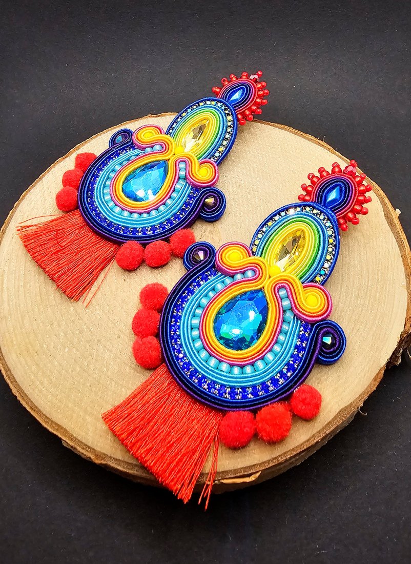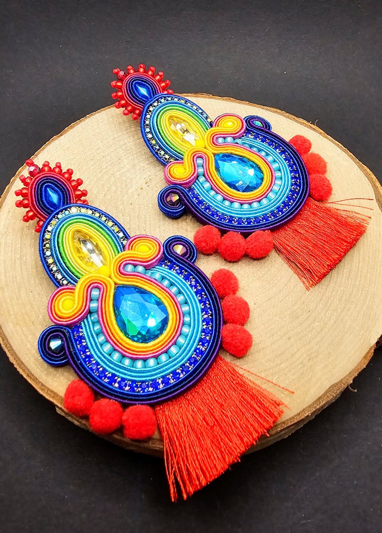 Turkusowe opalizujące fasetowane kryształki otoczone sznurkami sutasz, taśmą z cyrkoniami oraz szklanymi czeskimi i japońskimi koralikami. Dół kolczyków zdobią czerwone chwosty oraz pompony. Kolczyki zamocowane na sztyftach ze stali chirurgicznej w kolorze srebrnym. Kolory w kolczykach: czerwony, niebieski, fioletowy, żółty, zielony, turkusowy, różowy, pomarańczowy.