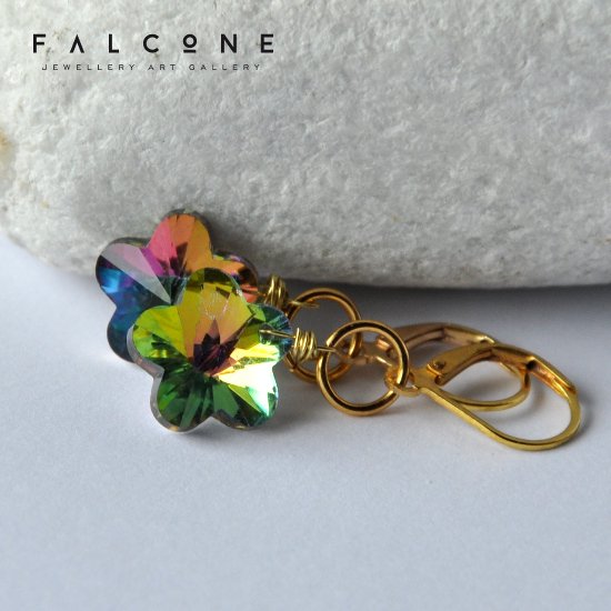 Kolczyki z motywem kwiatów w tęczowych barwach. Kolory zmieniają się w zależności od ułożenia, przyjmując barwy od chłodnych fioletów i fuksji, po cieplejsze tonacje morskiej i seledynowej zieleni, aż po złote ciepłe odcienie. Kolczyki oprawione w mosiądz i elementy pozłacane. Długość kolczyków to ok. 4 cm.