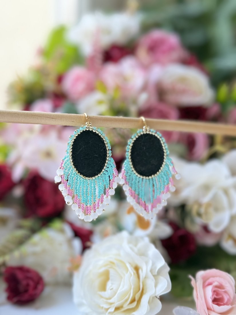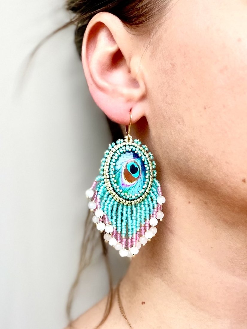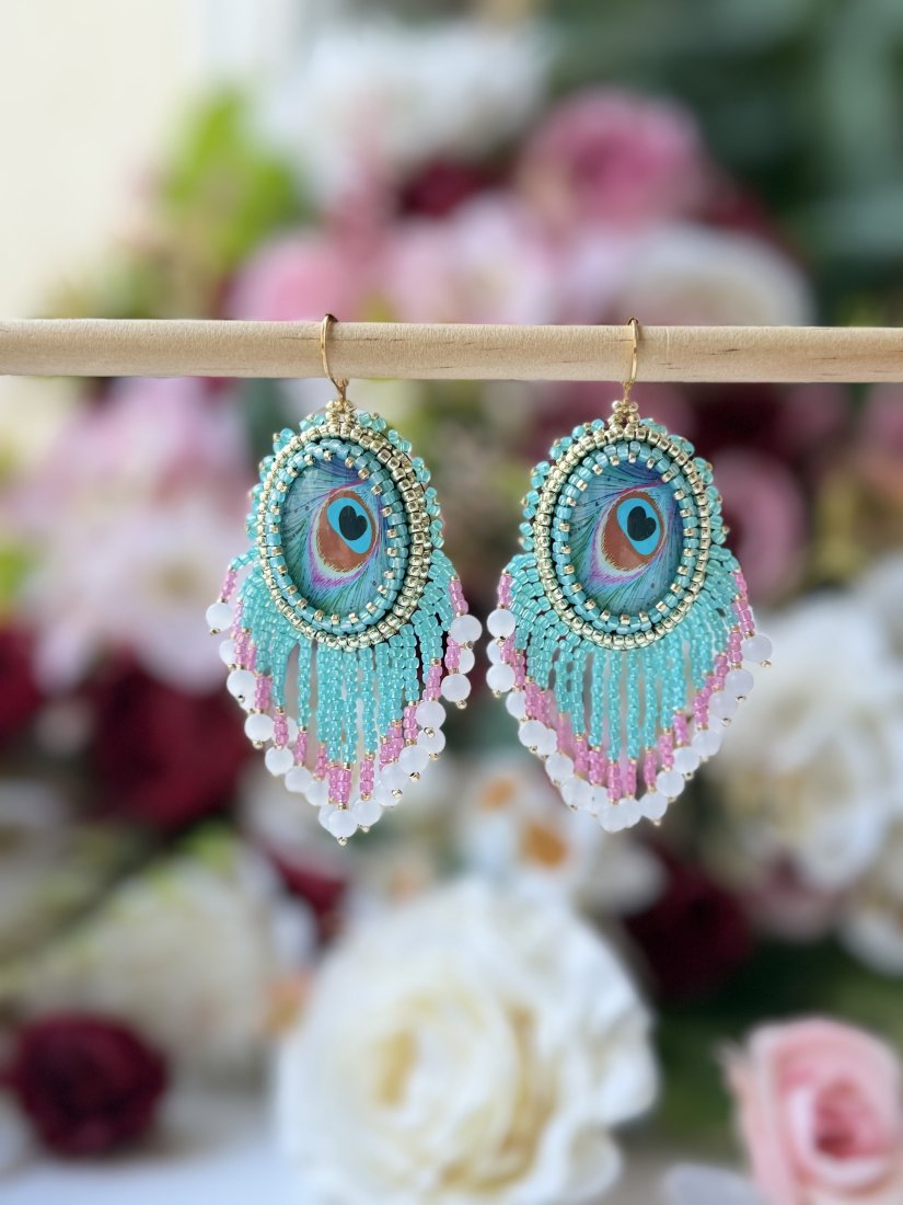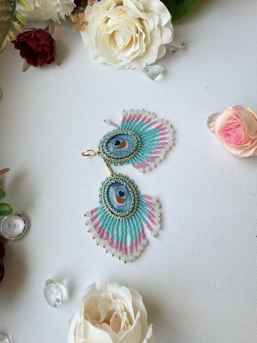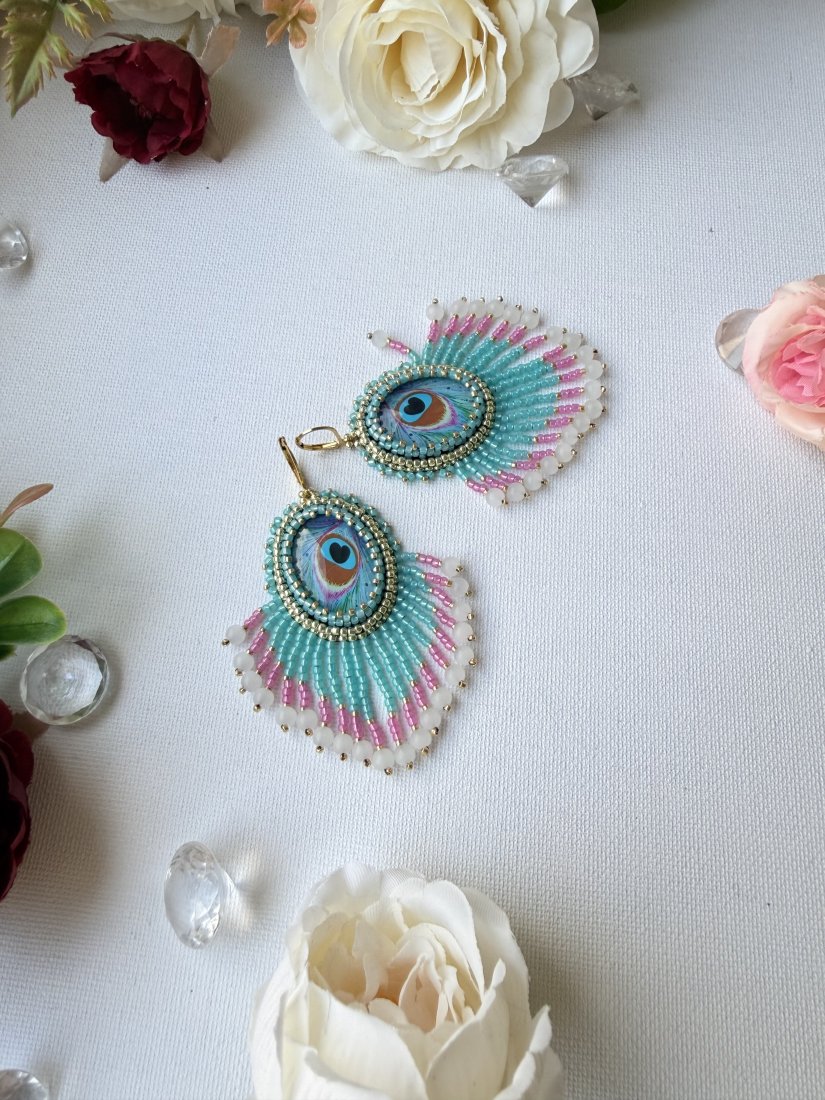 Odkryj magię kolorów z unikalnymi kolczykami "Tęczowe Marzenie"! Te ręcznie wykonane kolczyki zachwycają detalem pawiego oka, które mieni się wszystkimi barwami tęczy. Centralny motyw otoczony jest delikatnymi, szklanymi koralikami w odcieniach turkusu, różu i bieli, które dodają blasku i elegancji. Frędzle w pastelowych kolorach kołyszą się z każdym ruchem, tworząc efektowny i dynamiczny look.