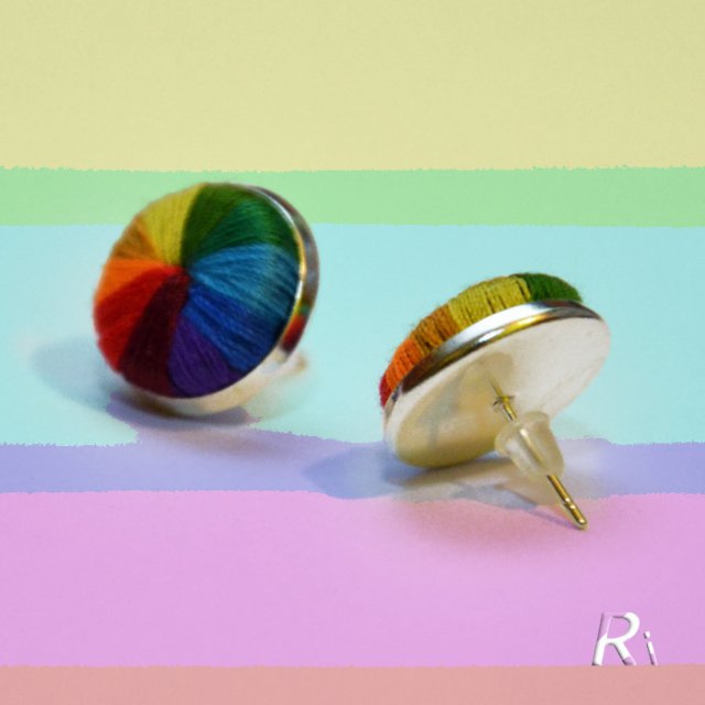 Delikatne sztyfty wykonane zostały z czarnego rzemyka oplecionego nitkami w odcieniach tęczy. Średnica ok 1,5 cm. Zapakowane w pięknym papierowym pudełeczku.