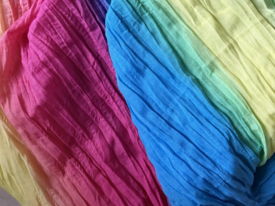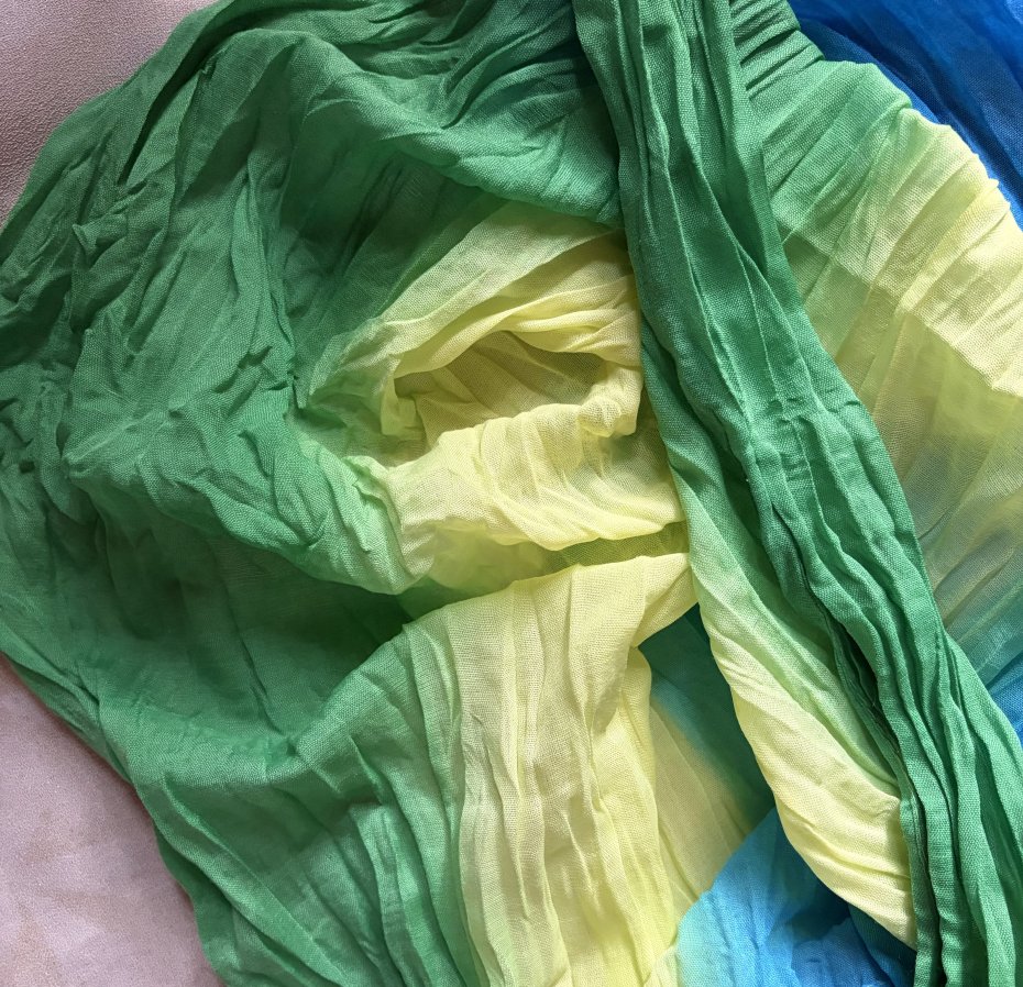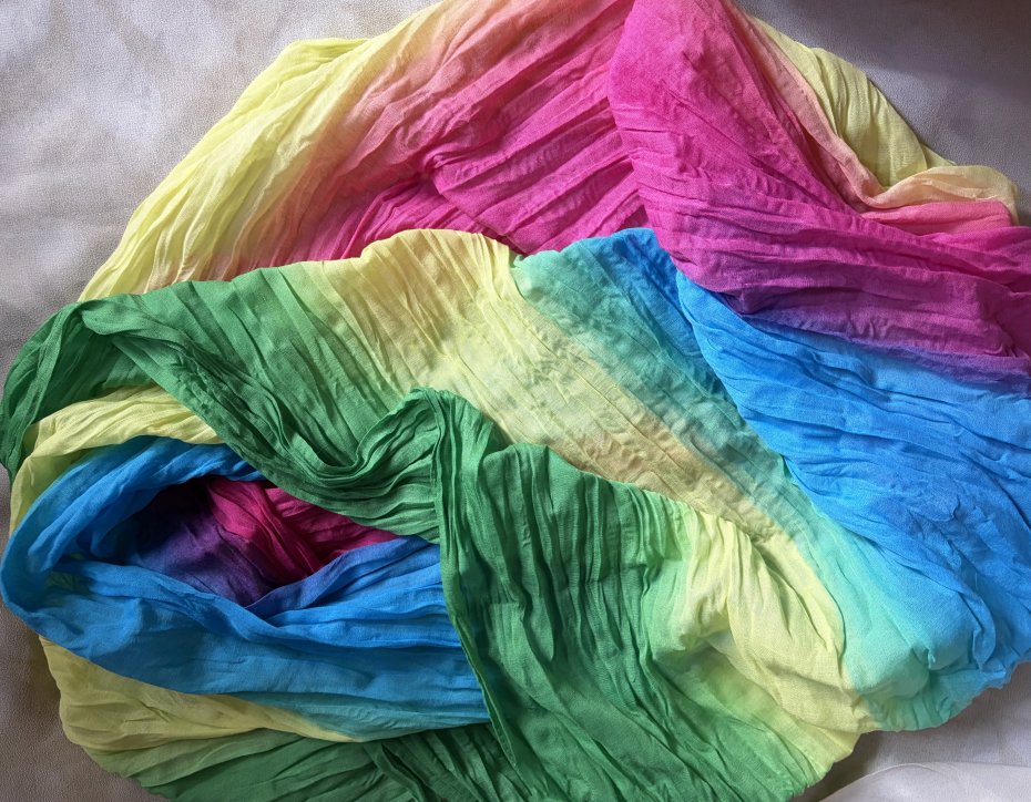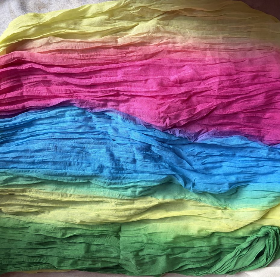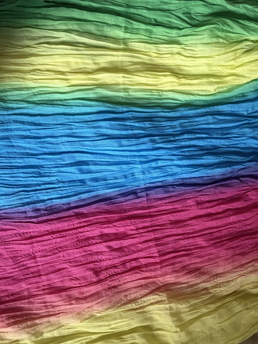 Tęczowy , gnieciony komin . Radosne. żywe barwy . Miły w dotyku . Brak metki ze składem , ale jest to materiał naturalny- być może z jakąś domieszką . . Szerokość bez rozciągania prawie 100 cm . Złożony na pół tak jak jest zszyty 82 cm Stan zachowany bardzo dobry - minimalne ślady użytkowania .Brak metek .