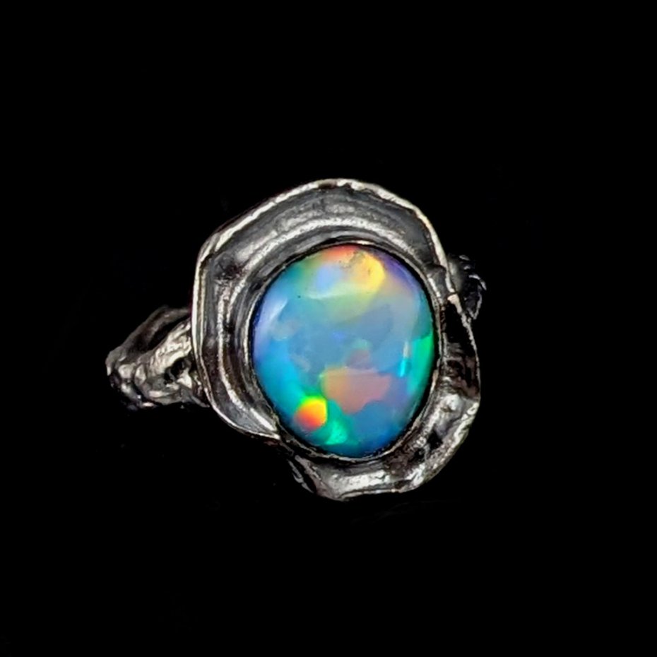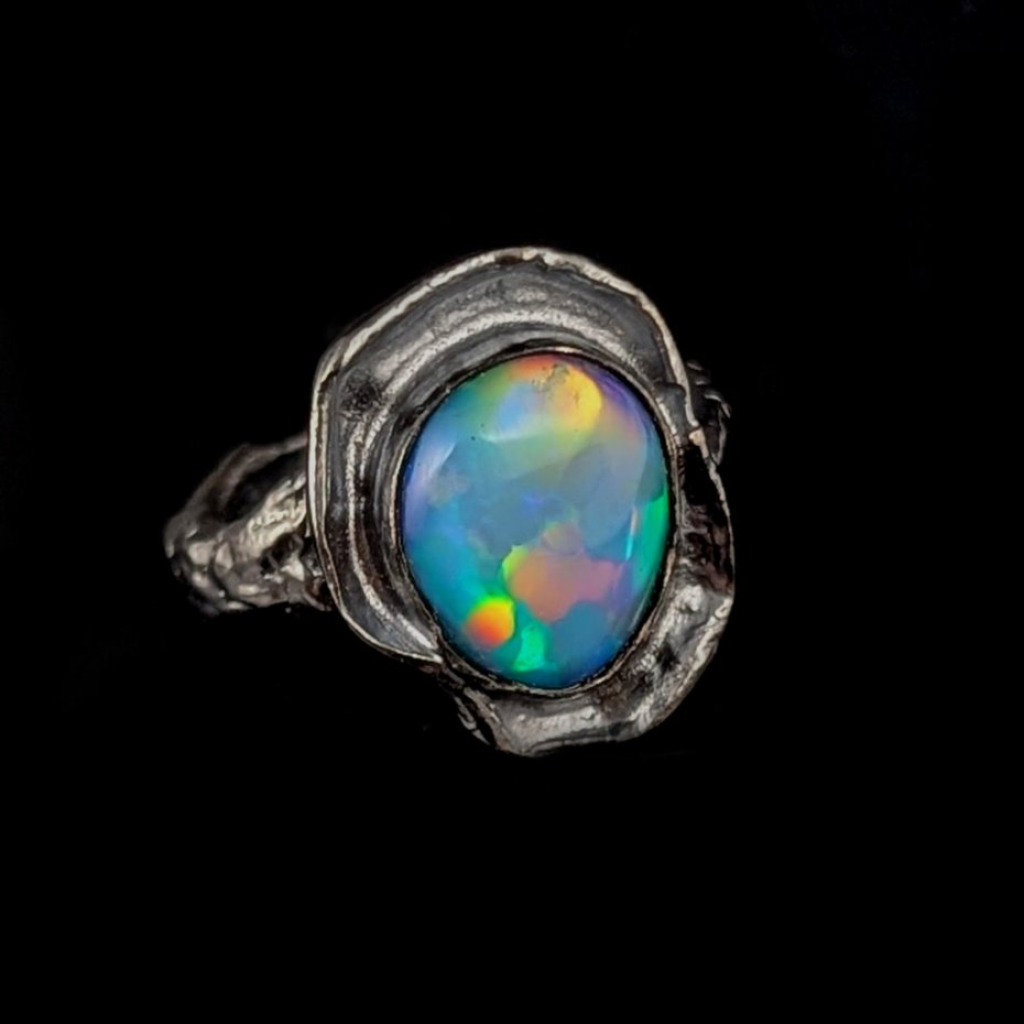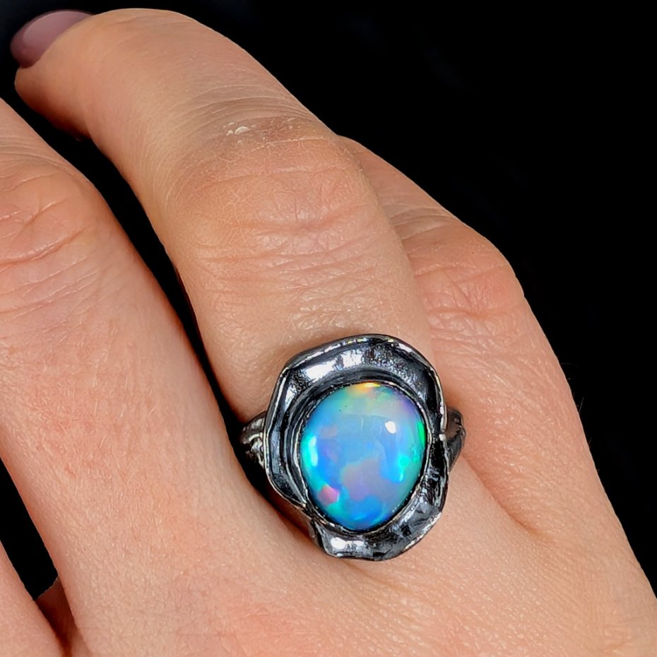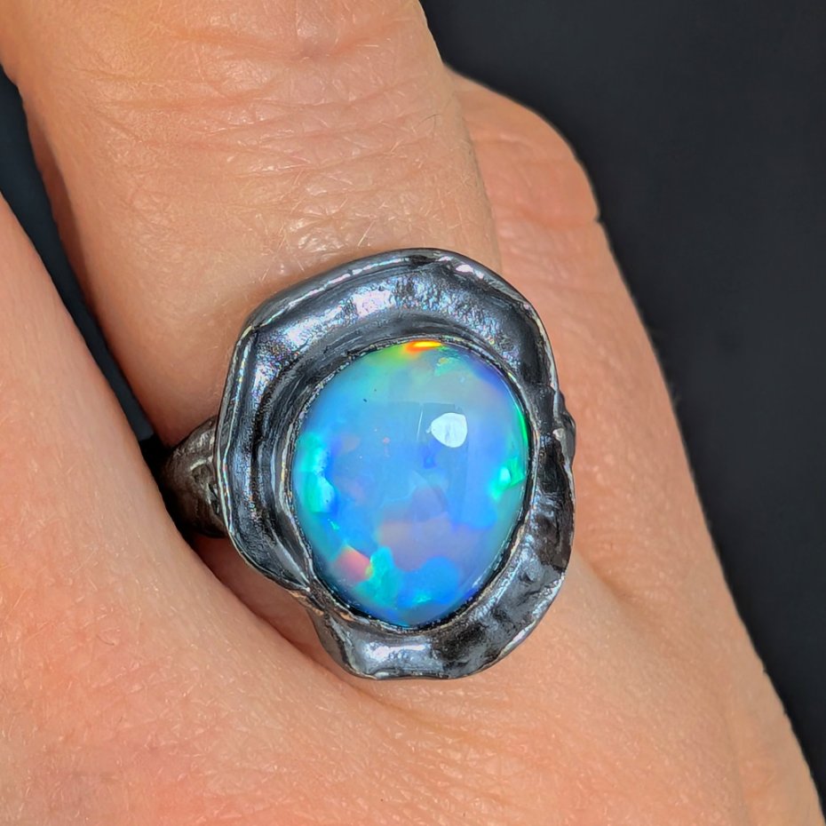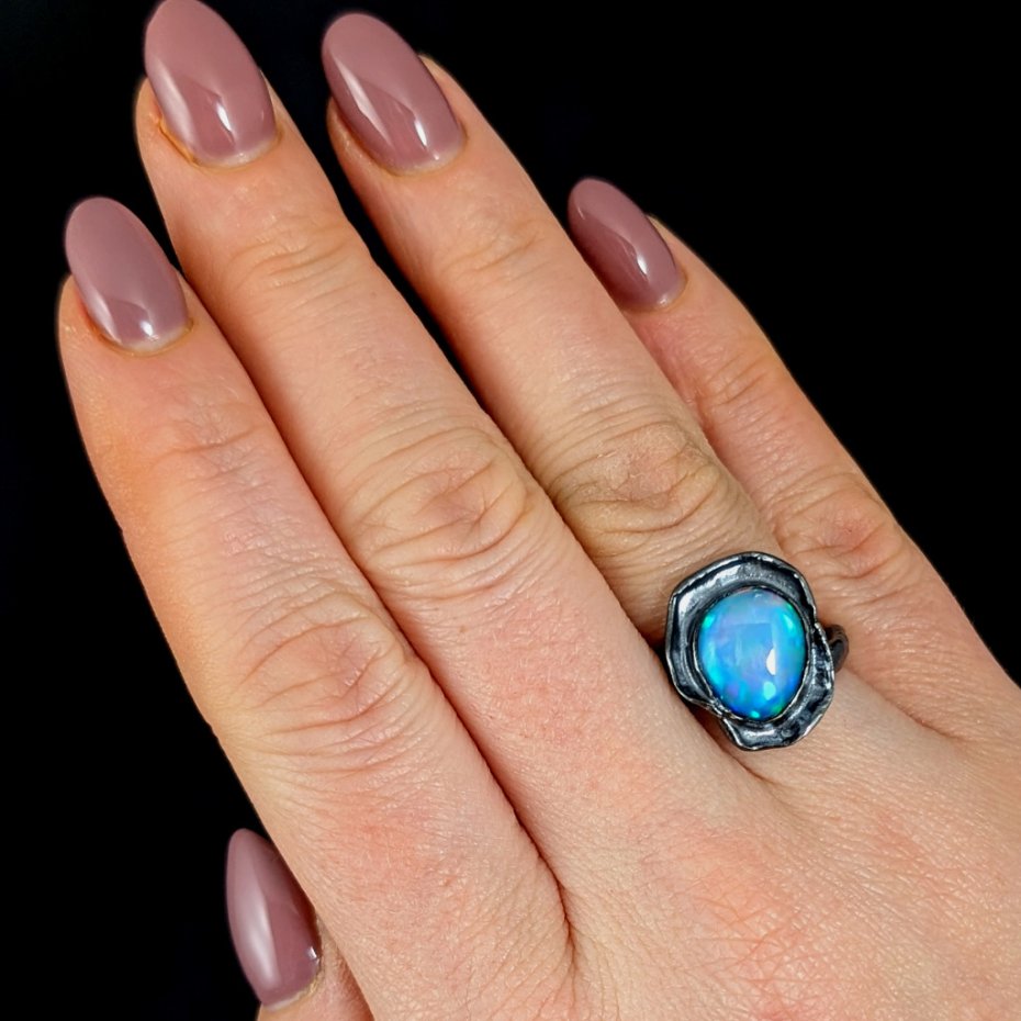Pierścionek wykonany z oksydowanego srebra próby 925. Rozmiar pierścionka dzięki otwartej podstawie regulowany, mogę dopasować na dowolny rozmiar w zakresie 9-23, proszę napisać na jaki ustawić. Ozdobą pierścionka jest multibarwny opal z Etiopii. Wymiary oprawy kamienia 14 x 11 mm, szerokość maksymalna obrączki mm, min. 4 mm. Waga 5,75 g. Pierścień zostanie zapakowany w ozdobne pudełeczko.
