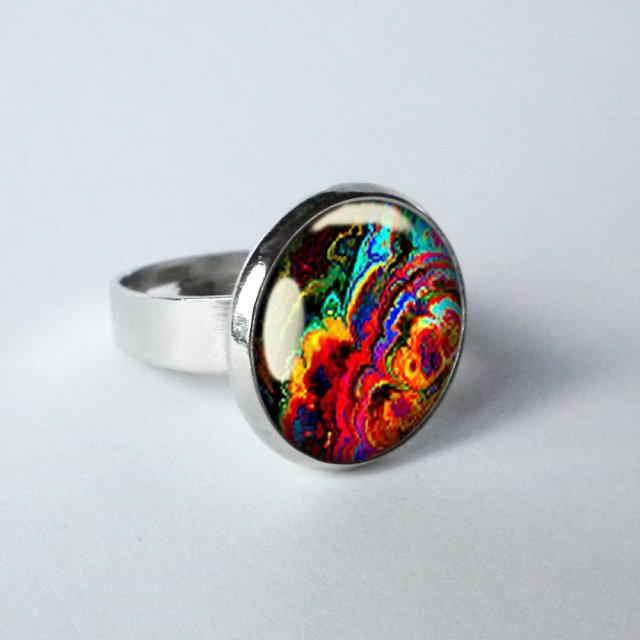 Oryginalny, nieduży pierścionek z okrągłym oczkiem z unikatową grafiką artystyczną, umieszczoną pod szklanym kaboszonem (wypukłym szkiełkiem) i oprawioną w bazę w kolorze srebrnym (nie zawiera niklu i ołowiu, hipoalergiczna). Grafika jest najwyższej jakości, wywołana na wysokiej klasy papierze fotograficznym.