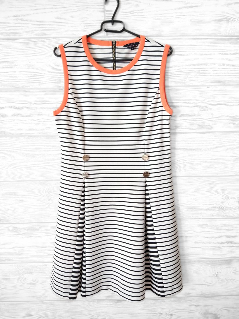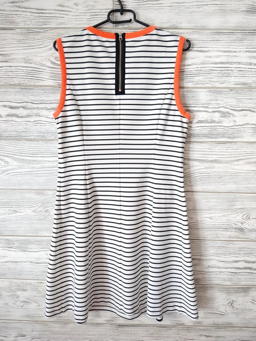 Sukienka w paski w marynarskim stylu z ozdobną kontrastującą lamówką.