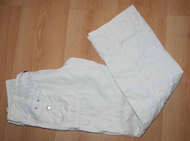 letnie spodnie, od projektanta. Materiał 100% len. długość nogawki regulowana, logowane nity i napy . Stan bardzo dobry. nie mieszczą się na manekin o rozmiarze 38.
