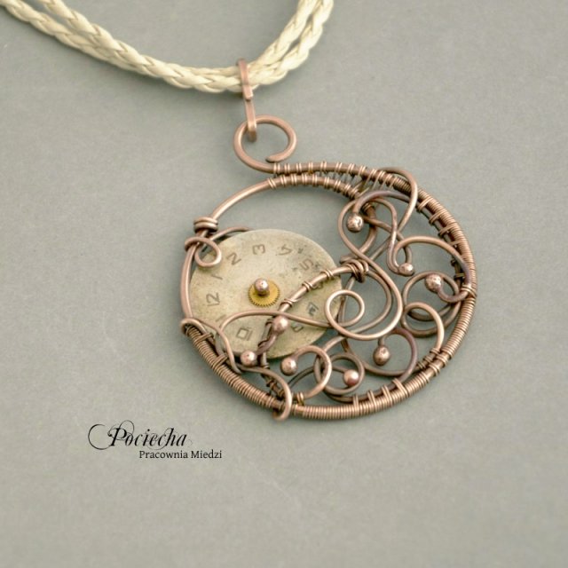 Naszyjnik w steampunkowym stylu stworzony od podstaw ręcznie pracochłonną techniką. Miedź połączyłam ze starą piękną tarczą zegarkową w stylu vintage.