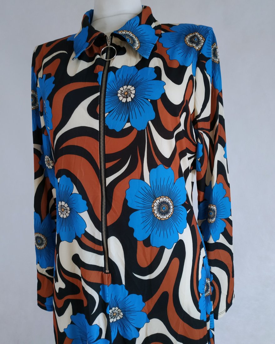 utrzymana w stylu lat 70-tych duże kwiaty. przód zapinany na suwak, kołnierzyk. Lekko taliowana, elastyczna, dopasowuje się.rękawy zgrabne, nie są szerokie przy mankietach. Kolory - beż, czarny, terakotowy i piękny ciemny turkus. Oryginalna, stylowa - super na różne okazje, wyjścia.