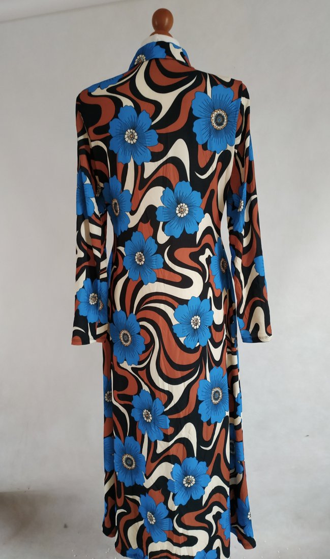utrzymana w stylu lat 70-tych duże kwiaty. przód zapinany na suwak, kołnierzyk. Lekko taliowana, elastyczna, dopasowuje się.rękawy zgrabne, nie są szerokie przy mankietach. Kolory - beż, czarny, terakotowy i piękny ciemny turkus. Oryginalna, stylowa - super na różne okazje, wyjścia.