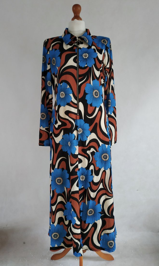 utrzymana w stylu lat 70-tych duże kwiaty. przód zapinany na suwak, kołnierzyk. Lekko taliowana, elastyczna, dopasowuje się.rękawy zgrabne, nie są szerokie przy mankietach. Kolory - beż, czarny, terakotowy i piękny ciemny turkus. Oryginalna, stylowa - super na różne okazje, wyjścia.