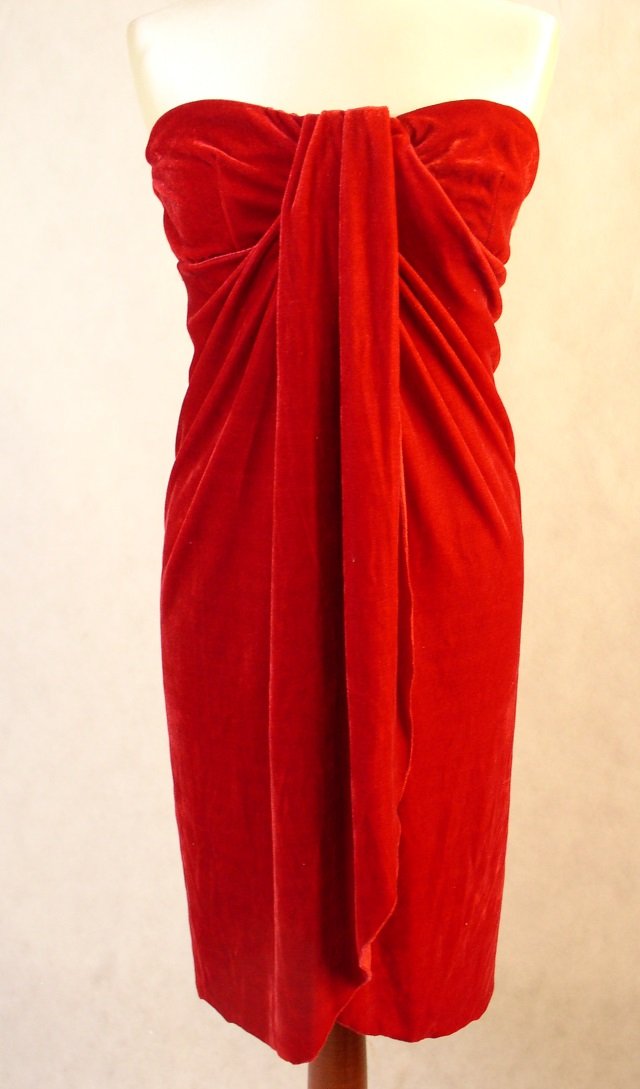 Wizytowa sukienka z metką,firmy Terranova.Rozmiar L.Materiał aksamit- 92% polyester+8% elastan.Podszewka czerwony syntetyk.Zapinana z tyłu na zamek.Bez ramiączek.Odcięta pod biustem.Przód rozcięty ,zakładany na siebie.Długość mierzona od pachy 87 cm.pod pachami 88 cm.Kolor krwisto czerwony.