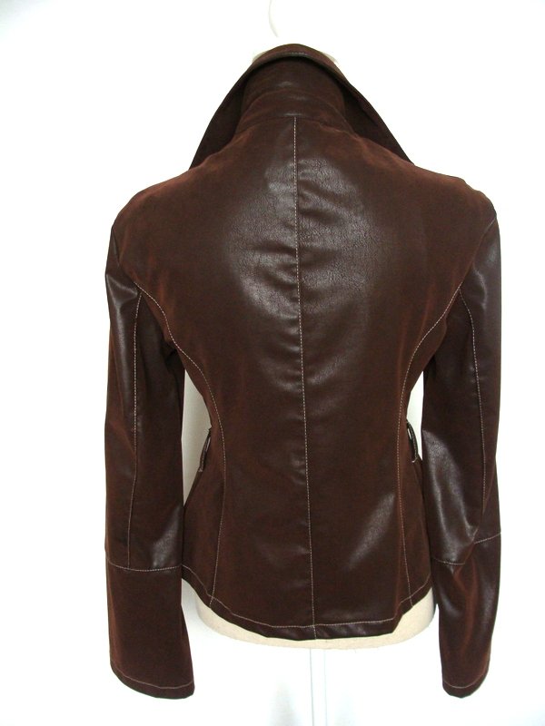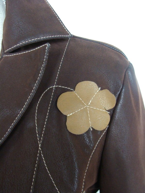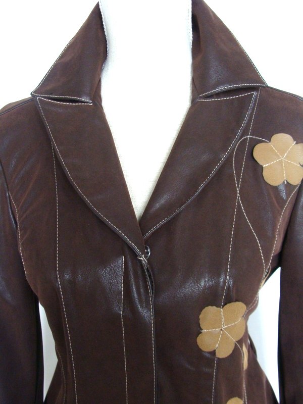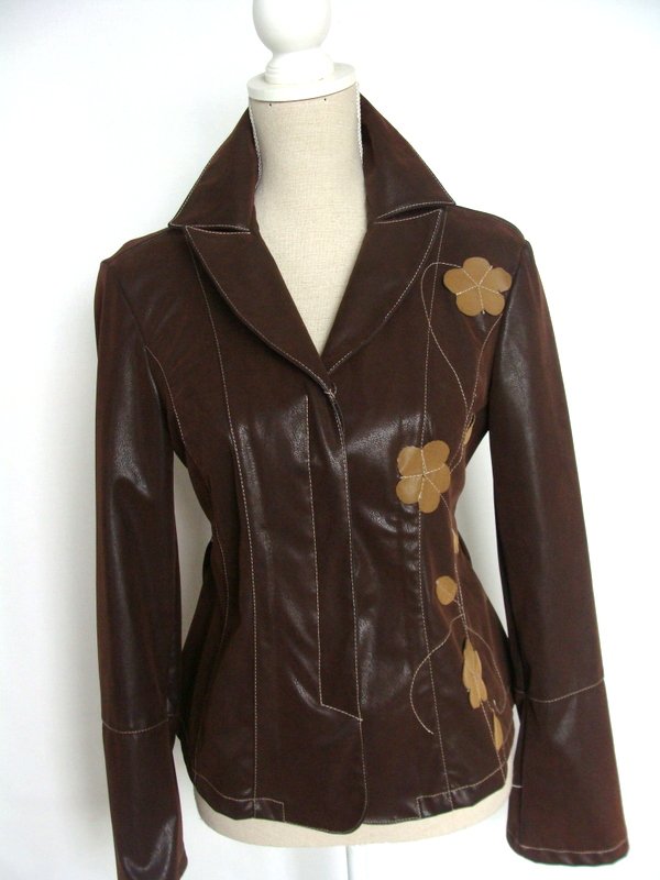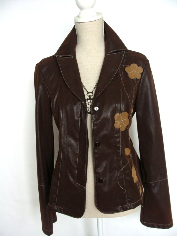 Bardzo zgrabna i ładnie odszyta włoska kurteczka/ marynarka z grubszej tkaniny imitującej skórę naturalna , w kolorze gorzkiej czekolady. Stębnowana nicią w kolorze złamanej bieli, z naszywanymi kwiatowymi aplikacjami w kolorze jasnego beżu. Zgrabny kołnierzyk z rewersami, kryte zapięcie na guziki, w pasie szlufki. Z podszewką do połowy pleców .