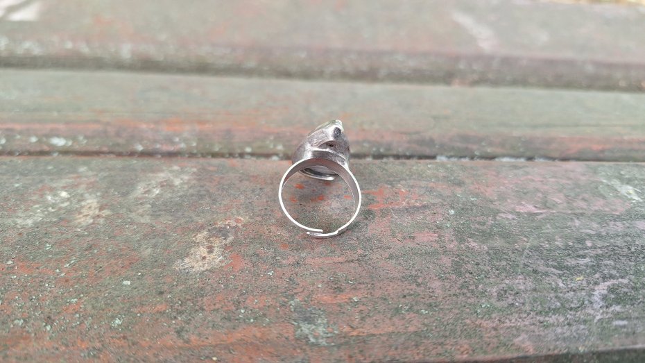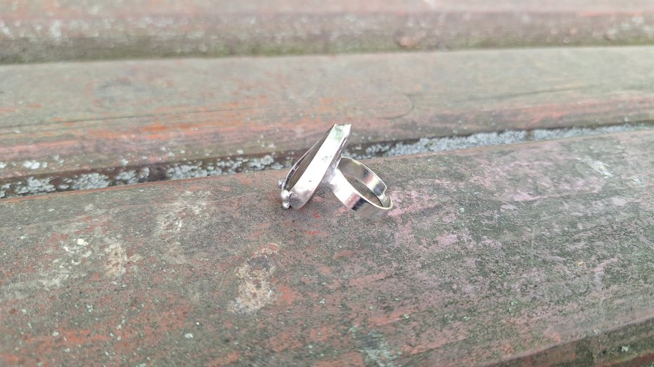 Pierścionek wykonany z miedzi, cyny i labradorytu. Wymiary ok. 2.5 na 1.3 cm. Regulowany. Nie jest ciężki.