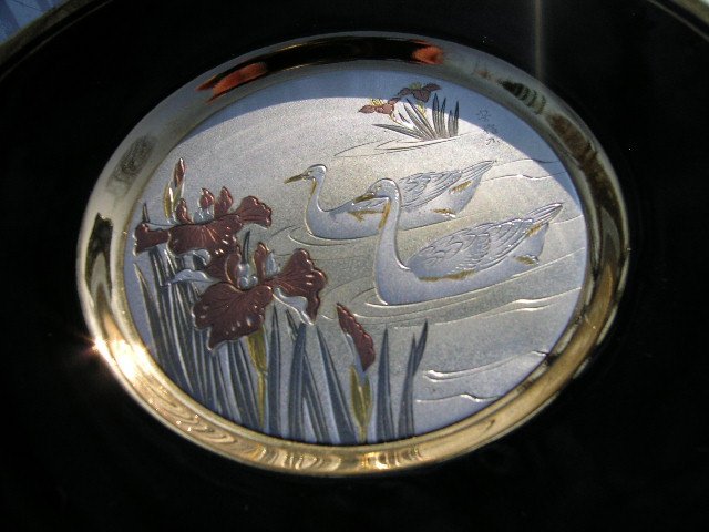 Porcelanowy Talerzyk zdobiony 24-ro Karatowym złotem. THE ART OF CHOKIN - zdobienie starą sztuką Samurajów. Japoński. Technika zdobienia nieprawdopodobna - efekt - na chłodnej bieli porcelany błyszczące złoto na rantach, perłowe srebrne tło i niuanse różnych złota odcieni od miedzi do platyny. Nooo...stara technika :) Podpis autora na awersie.