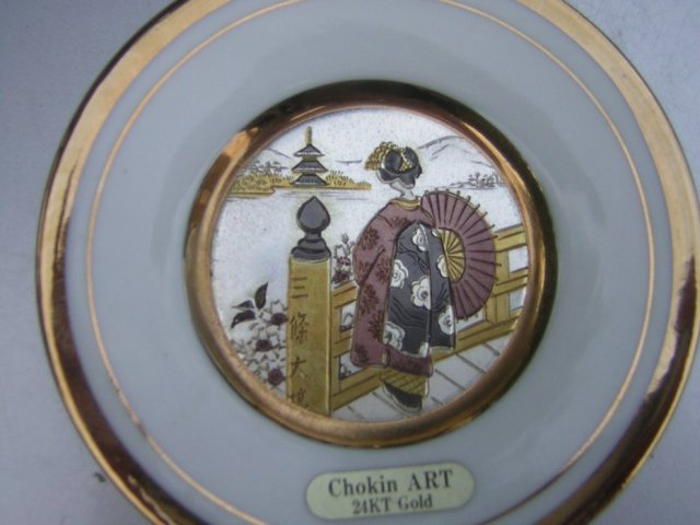 Porcelanowy Talerzyk zdobiony 24-ro Karatowym złotem. THE ART OF CHOKIN - zdobienie starą sztuką Samurajów. Japoński. Technika zdobienia nieprawdopodobna - efekt - na chłodnej bieli porcelany błyszczące złoto na rantach, perłowe srebrne tło i niuanse różnych złota odcieni od miedzi do platyny. Nooo...stara technika :) Sygnowany . KOLEKCJONERSKI.