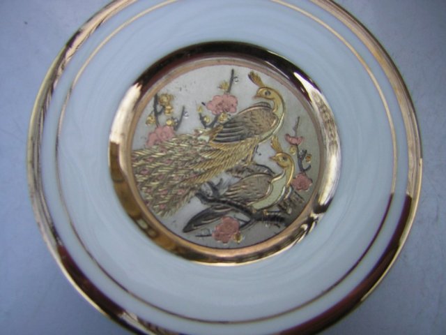 Porcelanowy Talerzyk zdobiony 24-ro Karatowym złotem. THE ART OF CHOKIN - zdobienie starą sztuką Samurajów. Japoński. Technika zdobienia nieprawdopodobna - efekt - na chłodnej bieli porcelany błyszczące złoto na rantach, perłowe srebrne tło i niuanse różnych złota odcieni od miedzi do platyny. Nooo...stara technika :) Sygnowany . KOLEKCJONERSKI.