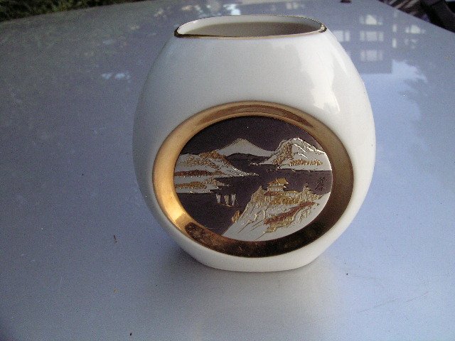 Porcelanowy Wazonik o ciekawym kształcie zdobiony 24-ro Karatowym złotem. THE ART OF CHOKIN - zdobienie starą sztuką Samurajów. Japoński. Technika zdobienia nieprawdopodobna - efekt - na chłodnej bieli porcelany błyszczące złoto na rantach, perłowe srebrne tło i niuanse różnych złota odcieni od miedzi do platyny. Nooo...stara technika :)