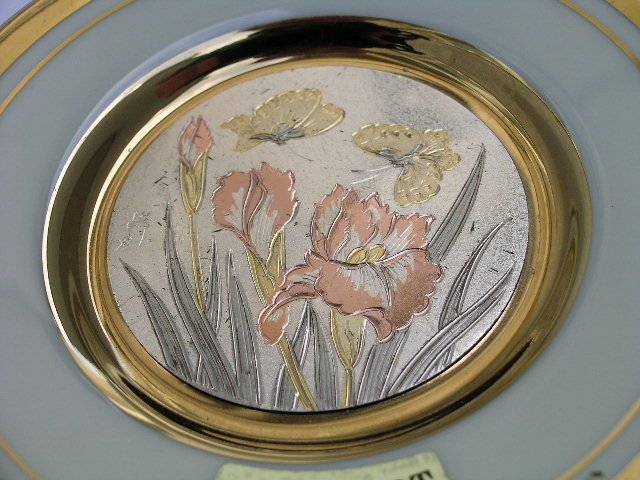 Porcelanowy talerzyk, wykonany wg 800-letniej tradycji rzemieślniczej. Ręcznie na awersie przez Artystę sygnowany; japoński. Dekoracje wykonywane początkowo na miedzi są następnie srebrzone i złocone. Oryginalnie te wzory umieszczano na zbrojach samurajów :) Zupełnie wyjątkowa historia... Białe tło i rzadko spotykana w tej serii złocona sygnatura. Malatura matowość i połysk. Precyzja wykonania. 10,5 (podstawa 5) x 1,5 cm. Z tyłu profesjonalny uchwyt do powieszenia. Stan zachowania dobry.