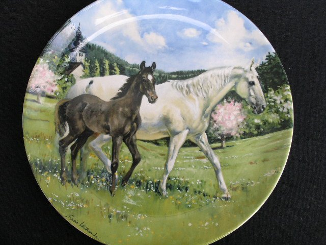 Talerz z kolekcjonerskiej serii autorstwa Susie Whitcombe z przedstawieniami najsłynniejszych sportowych ras koni w sceneriach ich oryginalnego pochodzenia. Sygnowany Spode, U.S.A., edycja limitowana z 1988 roku. Talerz notowany na międzynarodowej liście Bradex pod indywidualnym numerem 595 C. Fantastyczna jakość malatury i dźwięcząca szlachetnie ceramika. 21,5 x 2 cm. Stan zachowania bardzo dobry.