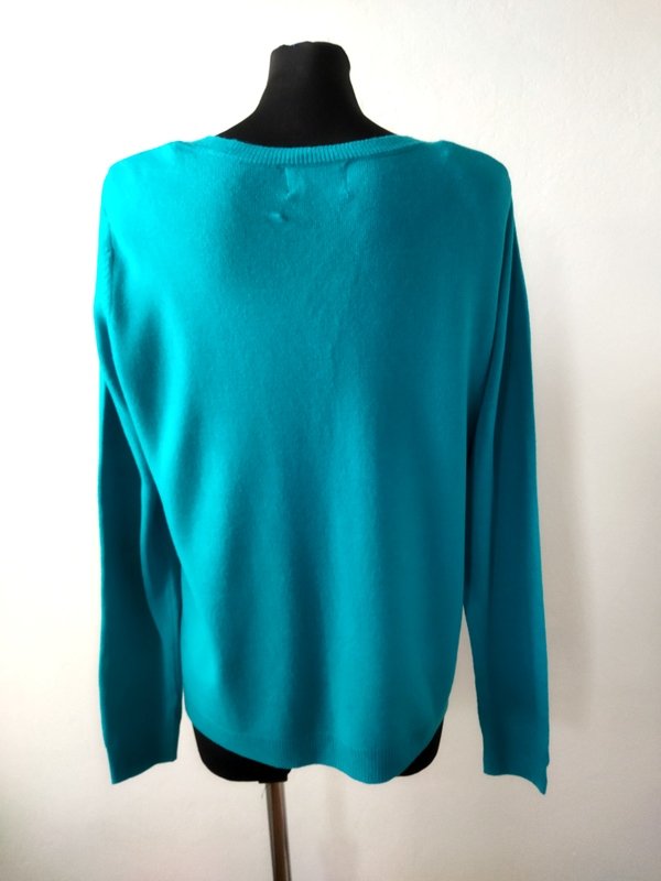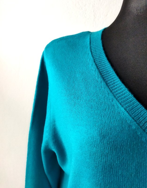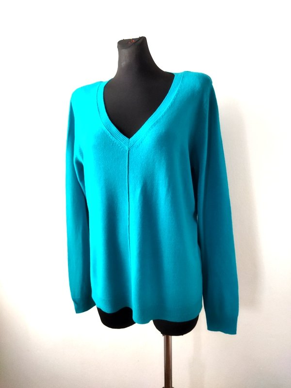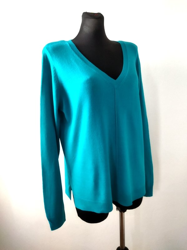 Miły akrylowy sweterek w szmaragdowym kolorze, z małymi rozcięciami po bokach, z dekoltem w szpic. wykończony ściagaczami