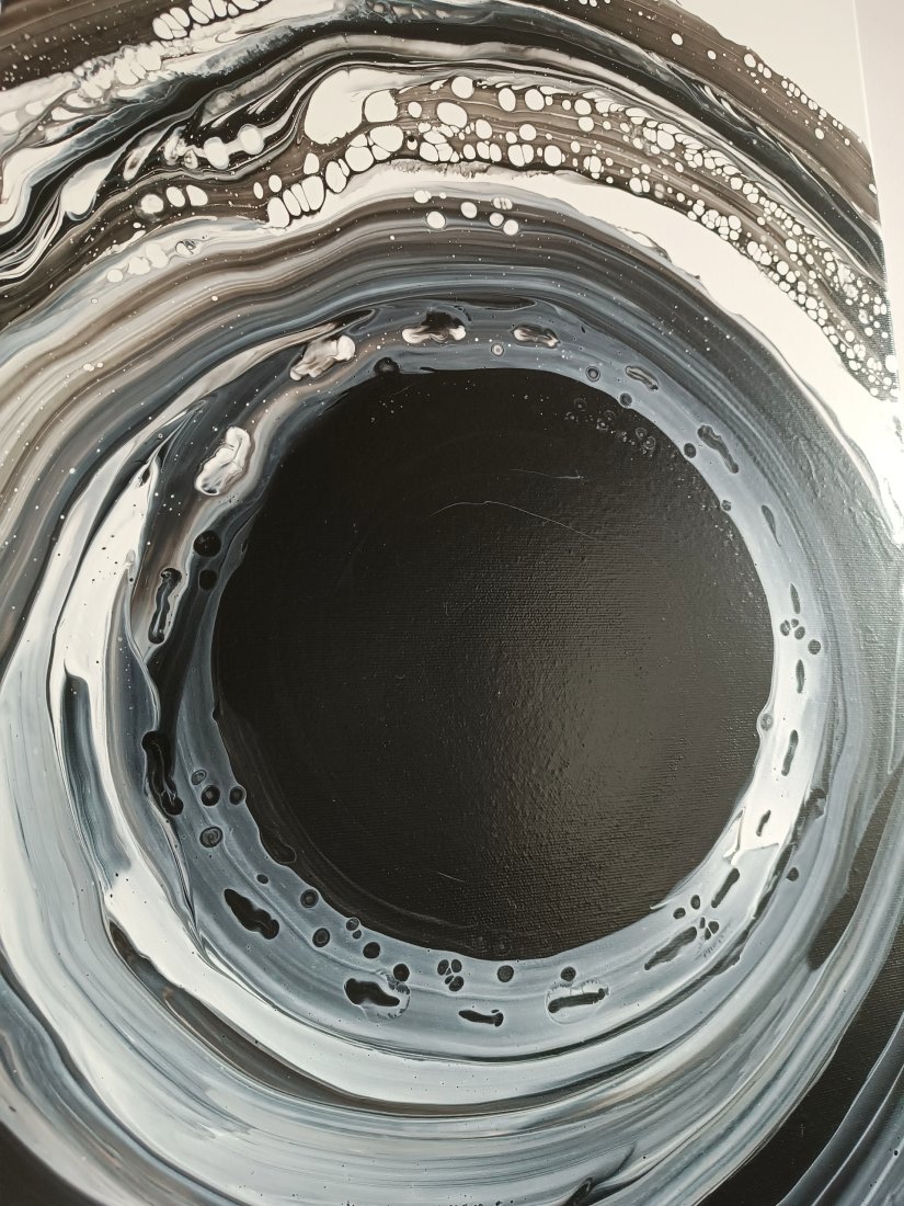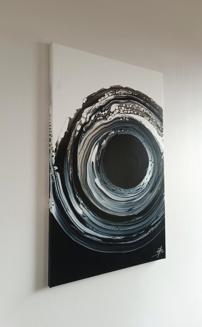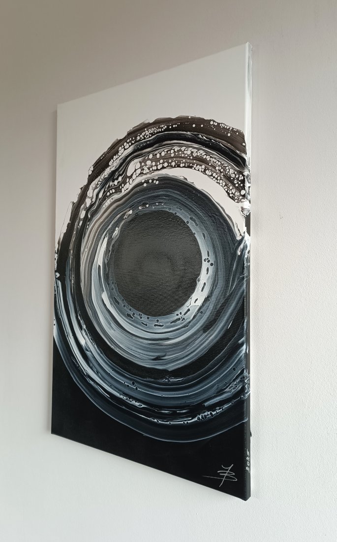 The Loop to czarno-białe, pędzące koło, gdzie ręczne, precyzyjne przeciągnięcia jednego koloru po drugim tworzą rodzaj kołowrotka. To metafora potocznego biegu chomika, ale tym razem to nie bieg po karierę, ale obracanie się w kole tych samych emocji i myśli. Sinusoida nastrojów, raz na wozie a raz pod nim, raz na powierzchni, a za chwilę znów pod wodą. To obraz fazy, w której cykl sie powtarza.