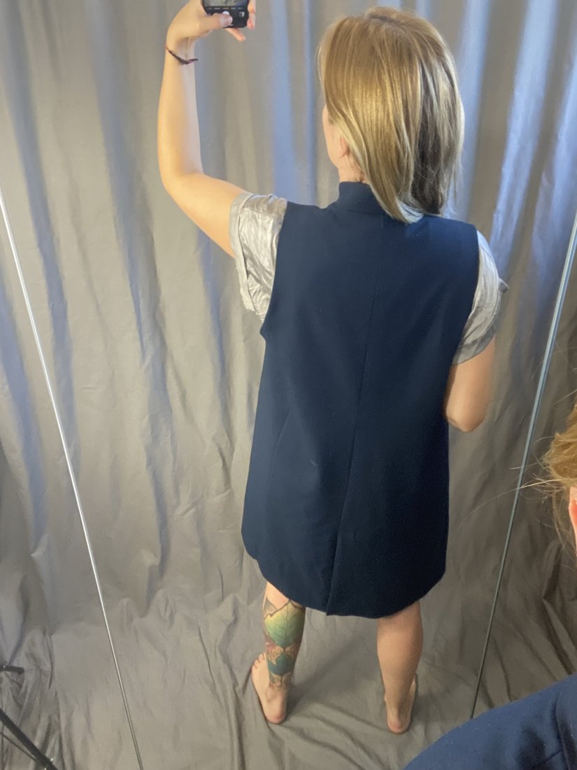 Kamizelka niezależnej marki modowej (the mercer) n.y.. 67% poliester, 29% wiskoza, 4% elastyna, podszewka z acetatu. Kamizelka uszyta w Niemczech. W sklepie kosztowała krocie.