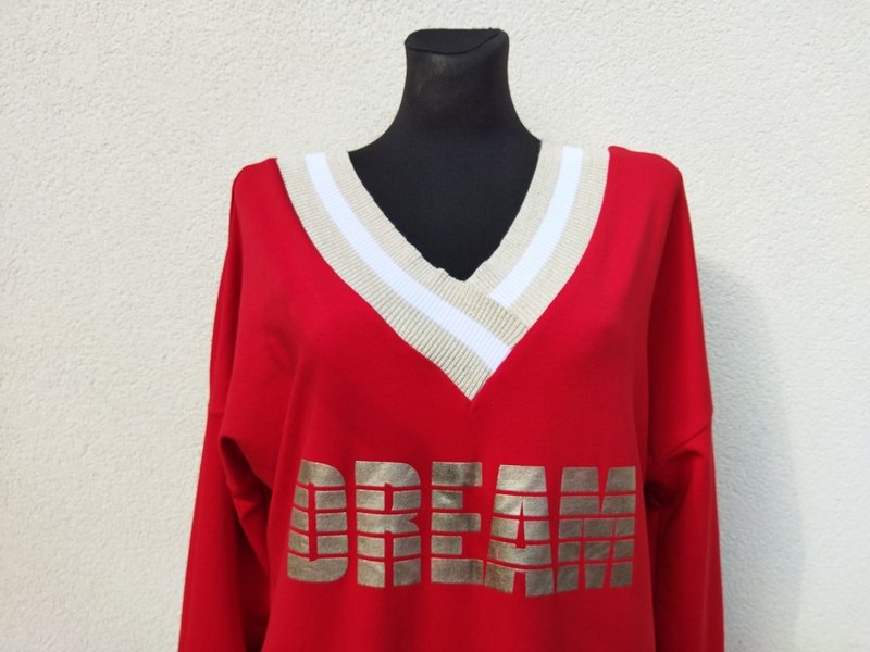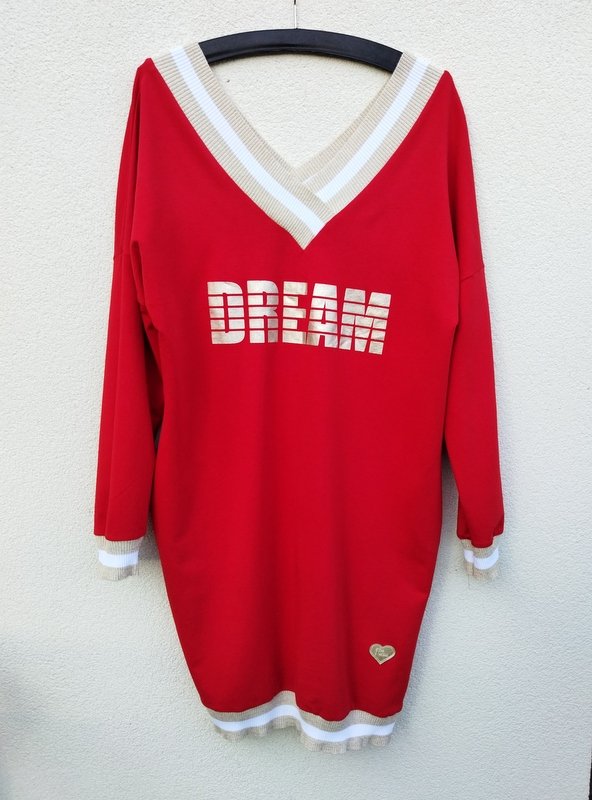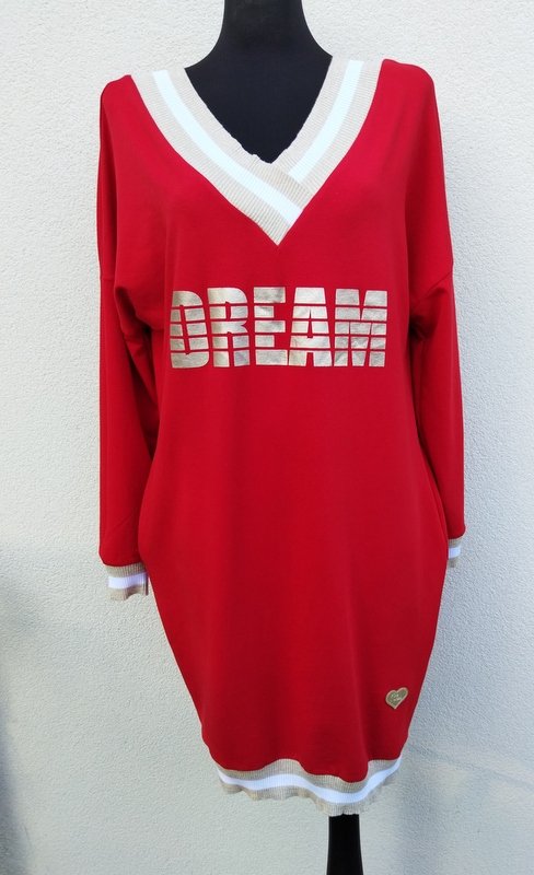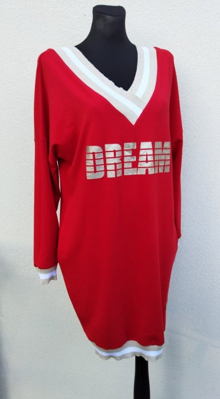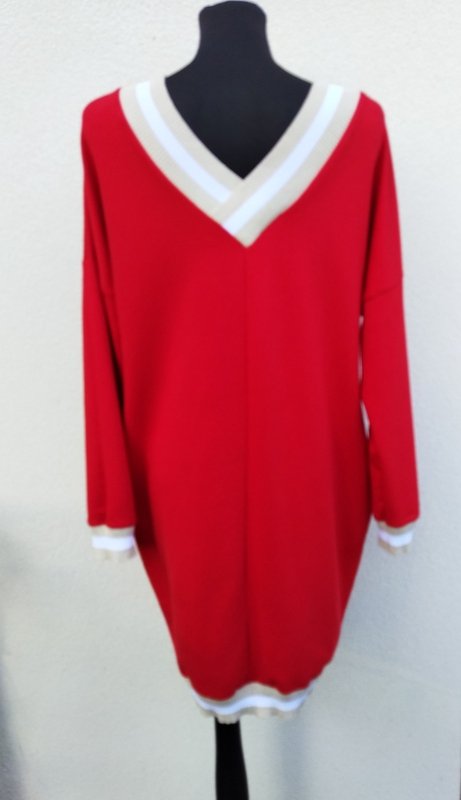 Świetna sukienka z bawełnianej tkaniny dzianinowej w kolorze nasyconej czerwieni, z dwiema wpuszczanymi kieszeniami w szwach bocznych.   Z dzianinowymi ściągaczami  w kolorach  bieli i beżu z metaliczną złotą nitką.
