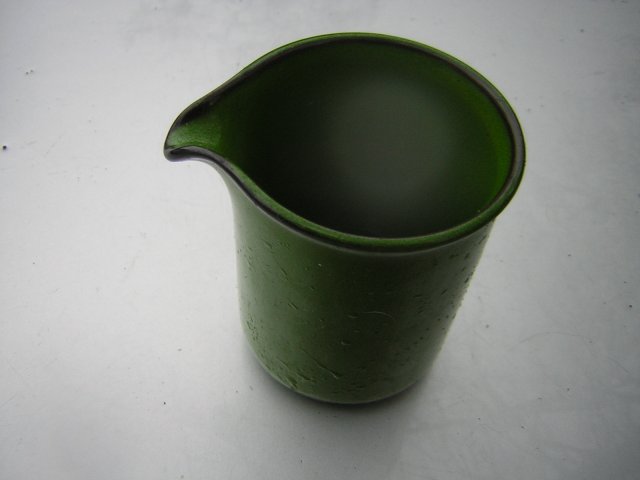 Porcelanowy mlecznik, sygnowany jakością Thomas Germany / grupa Rosenthal /. Lata 70 - e. Ciekawa bezuchwytowa nowoczesna forma i minimalistyczne zdobienie. Fantastyczne soczyście zielone szkliwo z efektami, brąz na rancie. Wykończenie satynowo - błyszczące, gładkie. Góra 7,5 x trochę ponad 6 cm dół 4,5 cm; wysokość 8 cm. Stan zachowania bardzo dobry. Zachowała się nawet oryginalna papierowa metka sklepowa. Nadaje się na ciekawy prezent.