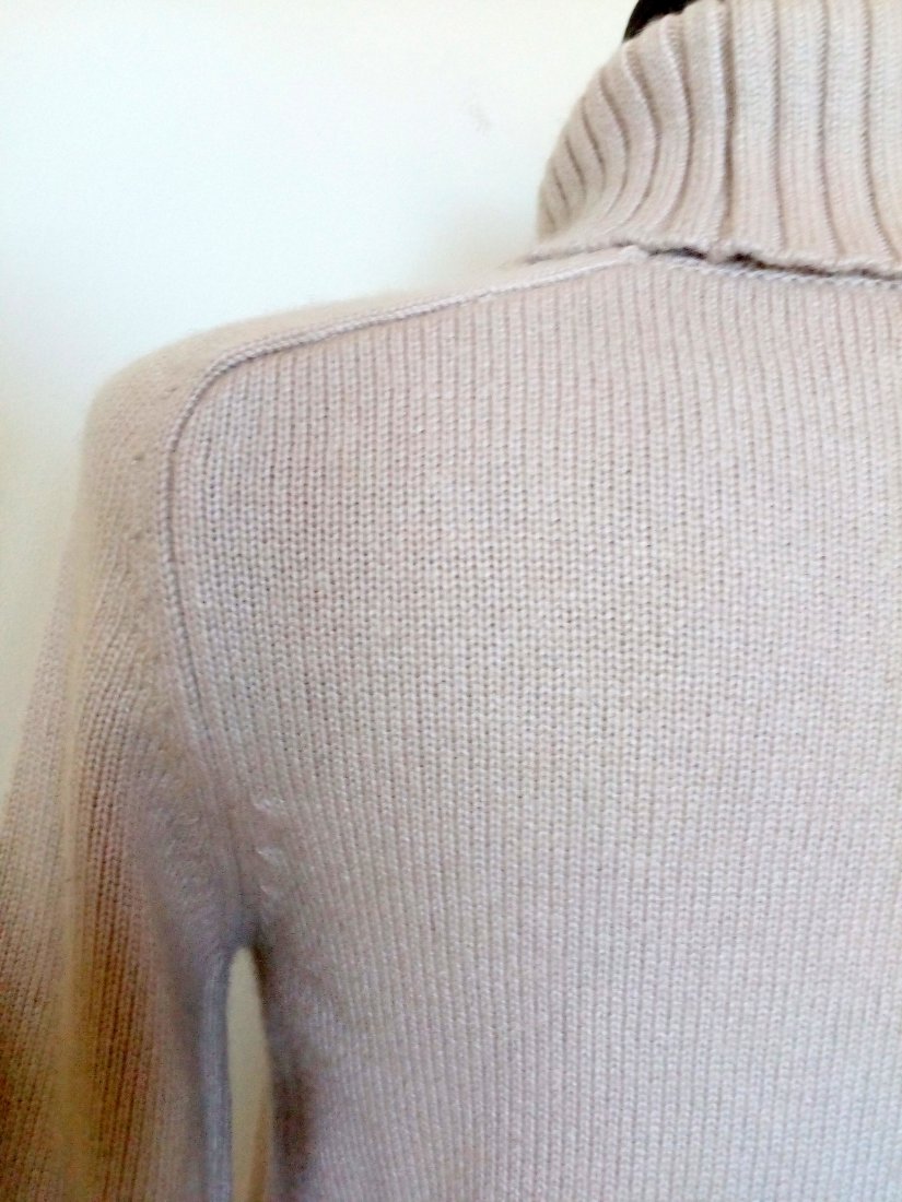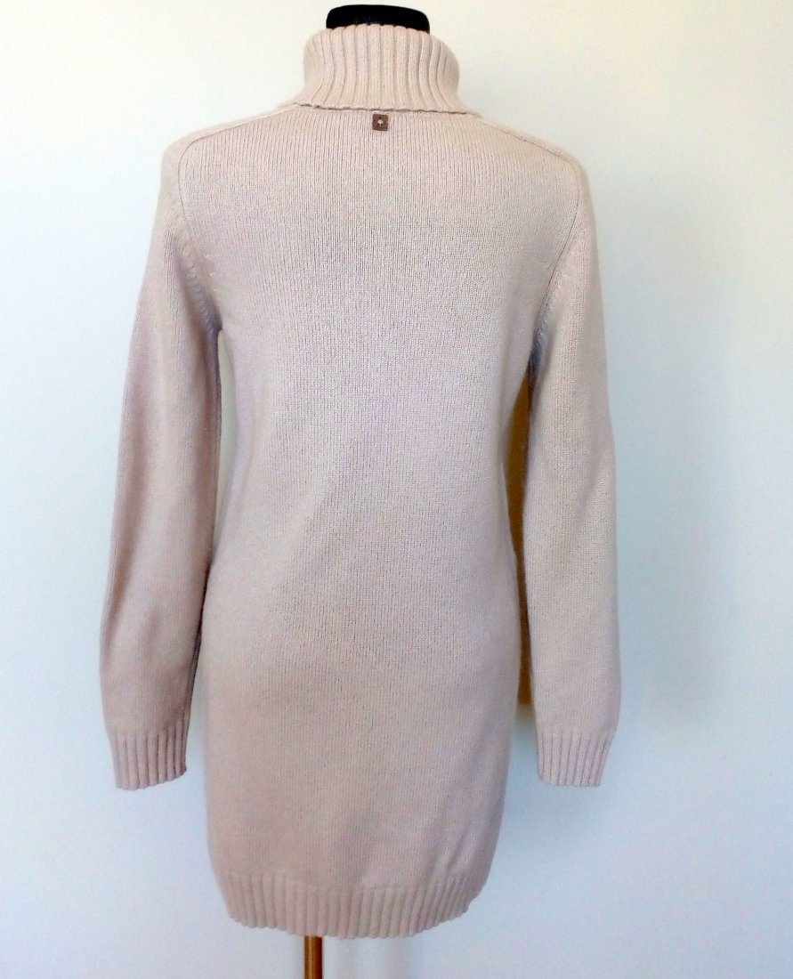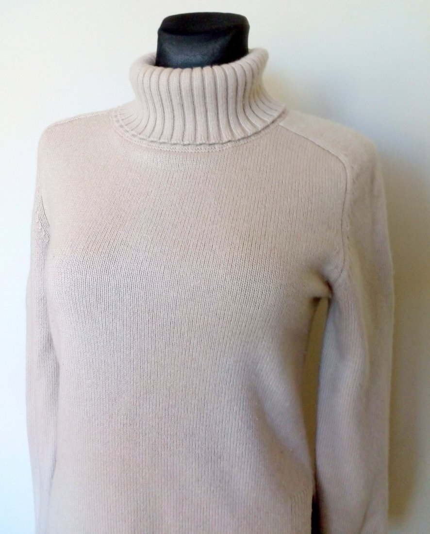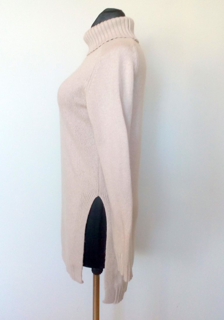 Długi golf w beżowym kolorze, asymetryczny - krótszy przód, rękawy raglanowe ze ściągaczem, sweter po bokach rozcinany, u dołu sciągacz