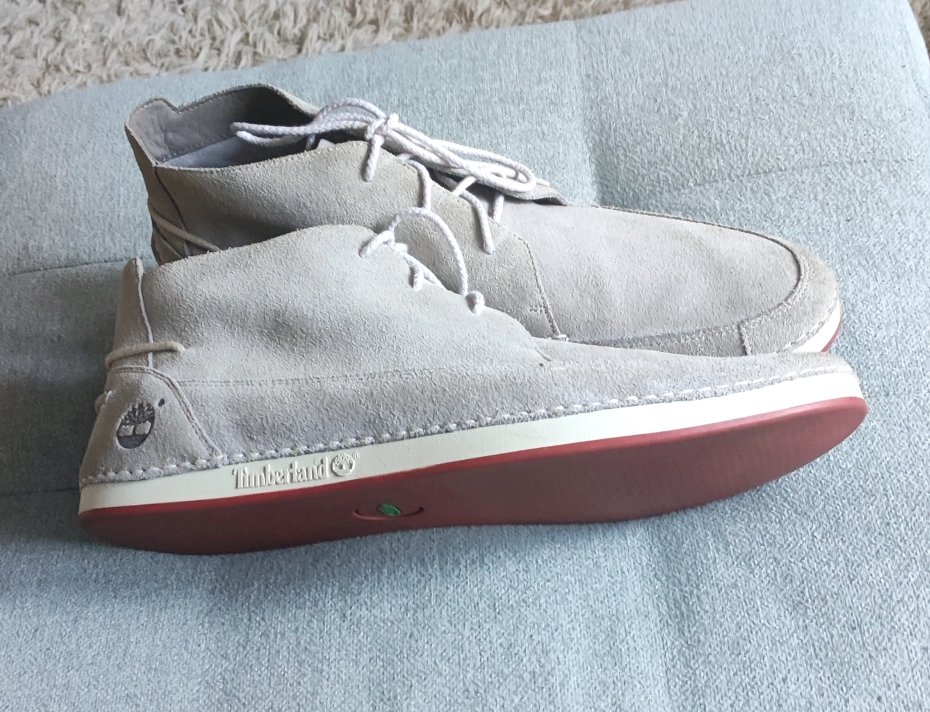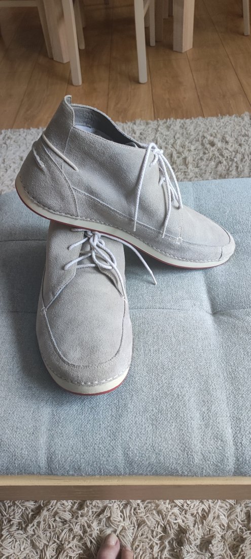 Wygodne buty zamszowe na wiosnę z naturalnej skóry w kolorze popielatym z odcieniem beżu.. Buty były noszone, ale są w bardzo dobrym stanie,bez przebarwień i plam na dość jasnym zamszu, a ślady użytkowania widoczne są jedynie na podeszwie. Rozmiar na metce EU 46,ale nie jest on adekwatny do rzeczywistego,zatem proszę się sugerować długością wkładki - 30,5.