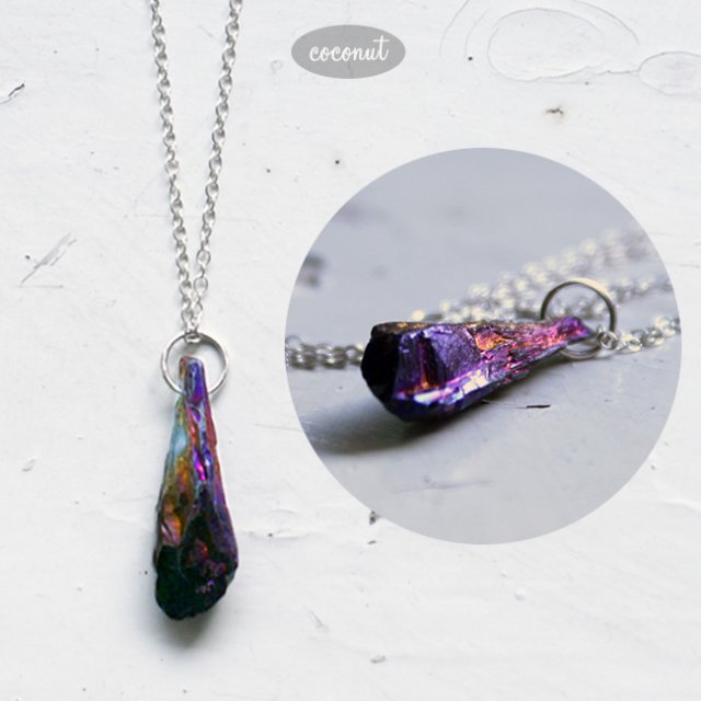 lekki wisiorek ze srebra, łańcuszek ok. 70 cm, naturalny surowy kryształ pokryty warstwą pięknie opalizującego tytanu, nieregularna bryłka ok. 2,6 cm.