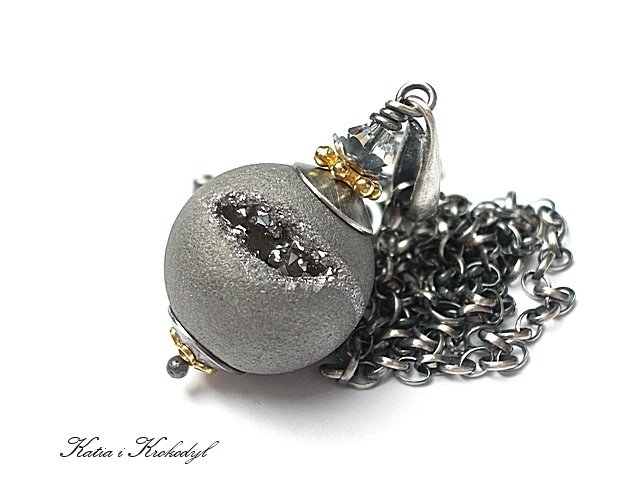Naszyjnik wykonany ze srebra i srebra pokrytego 24k złotem [pr.925] w połączeniu z kulą unikatowego agatu [17mm] z naturalnymi wżerami [ druza pokryta tytanem] oraz kryształkiem Swarovskiego [4mm] Srebro oksydowane i przetarte. Całkowita długość naszyjnika 57cm. Biżuteria ozdobnie zapakowana