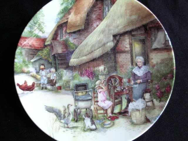 Porcelanowy kolekcjonerski talerz dekoracyjny, notowany na międzynarodowej liście Bradex. Angielska edycja Royal Doulton z 1990 roku; nr 26-R62-35.3 wraz z indywidualnym numerem 4270G - seria dawnych rzemiosł. Tu: bogata narracyjnie scena z tkackiego podwórza... lata cudowność, babcine spotkanie z wnukami i zabawna rozmowa kota z gęsią... Obrazek z niezaprzeczalnym klimatem. Najwyższa jakość nadruku i porcelany.