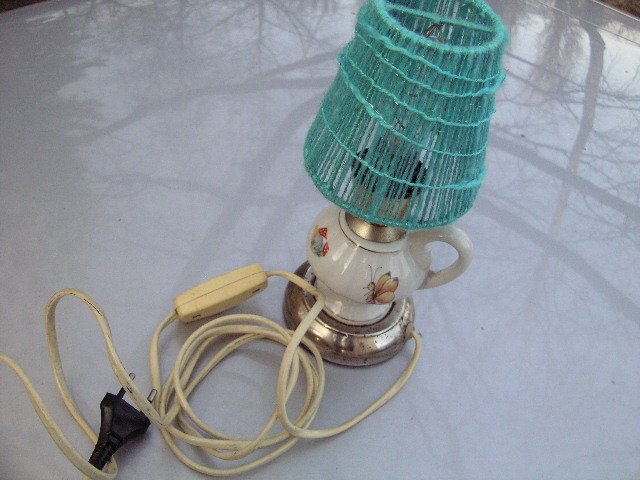 Starej daty Lampka do dziecinnego pokoju...Porcelana pięknie, baśniowo zdobiona z wygodnym uchem do przestawienia. Biel porcelany i delikatne barwy zdobienia ...kaczuszka,motylek,muchomorki,zegar z kukułką...całość na błyszcząco wykończona. Postawa metalowa,oprawka na żarówkę z małym gwintem. Abażur nie jest oryginalny - zakładany na żarówkę i wypleciony włóczką w turkusowej tonacji ze szczyptą metalizującej nici...daje piękne świetlne refleksy, łagodnie mrok rozpraszając, Oczywiście stosujemy żarówki o nie dużej mocy...ale do tego właśnie służy lampka nocna ;)