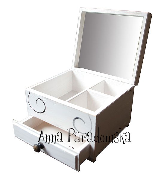Drewniana szkatułka na biżuterię, z lusterkiem. Trzy przegródki + szufladka. Ręcznie pomalowana farbami akrylowymi, zabezpieczona ekologicznym lakierem półmatowym (delikatny połysk). Kolor: biały + przetarcia czarny/biały/złoty, koty czarny i szary. Możliwość zamówienia innego koloru. Wymiary: 17 x 14,4 x 12 cm.