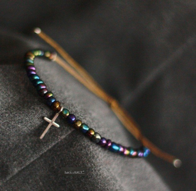 Minimalistyczna bransoletka wykonana z woskowanego beżowego sznurka , oraz ślicznych szklanych koralików toho (ok.4mm) w kolorze różnokolorowym (benzynka) , a także elementów z metalu antyalergicznego (wolne od ołowiu i niklu) w kolorze srebra . Efektownie wygląda razem z innymi bransoletkami tego typu (zdj.-3) .