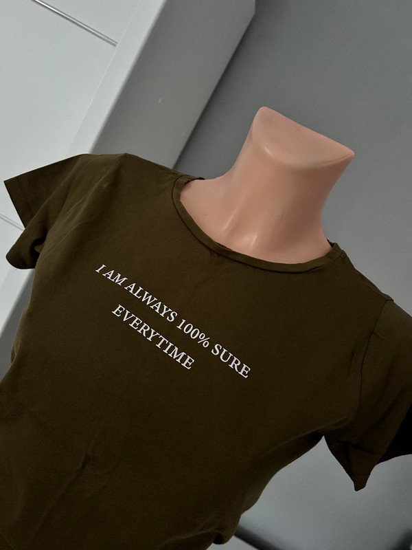 T-shirt marki Tom&Rose, rozmiar z metki to jest 36. Wykonany w 100% z bawełny. Ma piękny kolor khaki. Posiada napis I am always 100% sure everytime.