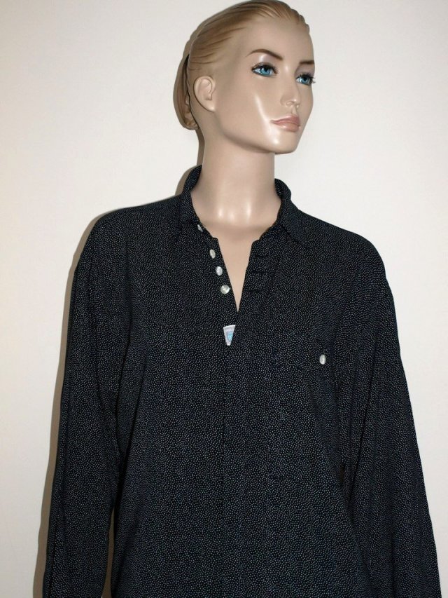 śliczna koszula vintage marki tom tailor, w czarnym kolorze w drobniutki biały maczek. koszula jest męska, ale myślę, żechętniej założą ją panie. Materiał 100% wiskoza. na manekinie o rozmiarze 38. guziczki częściowo chowane pod plisą, pacha trochę niżej wszyta.stan bardzo dobry. Podaję wymiary mierzone na płasko;