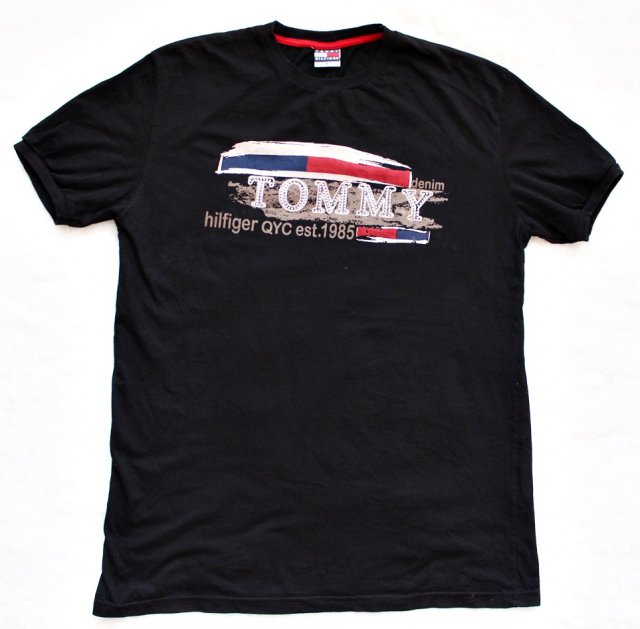 Czarny t-shirt z grafiką. Napis TOMMY dekorowany srebrnymi koralikami. T-shirt posiada wewnętrzną wszytą metkę z logo marki Hilfiger, adresem oficjalnej strony marki Hilfiger i numerem CIF co świadczy o autentyczności produktu.