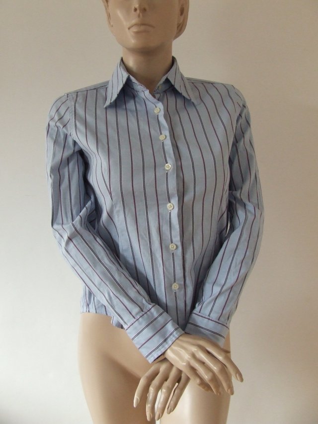 Elegancka damska koszula Tommy Hilfiger, dopasowana, z kołnierzykiem, zapinana na logowane guziki, błękitna w paski, wymodelowana zaszewkami. Na dole posiada wyhaftowane logo. Polecam!