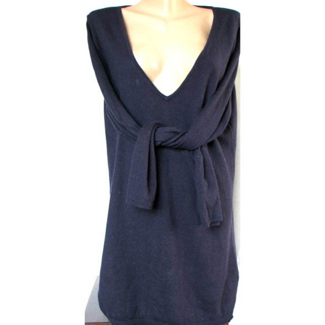 Granatowy sweterek o prostym kroju firmy TOMMY HILFIGER z dekoltem w tzw. serek. Dekolt dość duży - głębokość dekoltu mierzona na płasko 32 cm. Wymiary na płasko: biust 52 cm, talia 49 cm. Długość mierzona przodem od ramienia 81 cm. Długość mierzona po wewnętrznej stronie rękawa 52 cm, od ramienia 71 cm. Sweterek rozciągliwy, dopasowuje się do sylwetki.