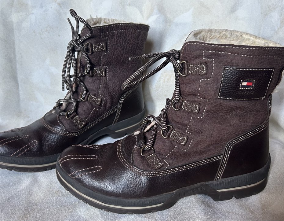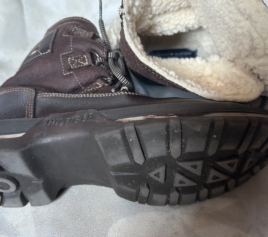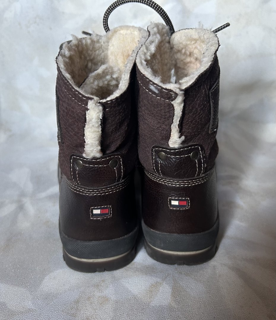 Tommy Hilfinger/ oryginalne ocieplane botki trapery . Rozmiar 39/40 .40 jest na podeszwie, ale grube skarpety i na 49 też będą dobre . Wiązane , wzmocnienia na czubkach buta i języku . Porządne wykonanie . Logo z tyłu , boku, na podeszwie z boku i wewnątrz buta . Ozdobne, kontrastowe przeszycia . Podeszwa 28 x 10 wysokość całkowita 19 cm góra 14 ( mierzone na płasko ) wewnątrz 25/26 ciężko dokładnie zmierzyć . Idealne na zimniejsze dnia . Stan zachowania bardzo dobry Minimalne ślady użytkowania .