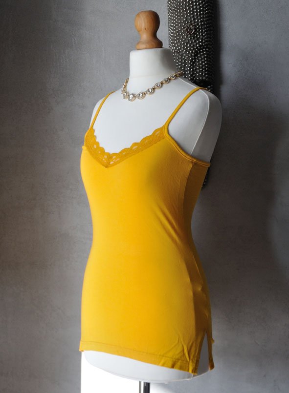 Uszyty z elastycznej, całkiem niezłej jakościowo wiskozy w odcieniu żółtka jajka (ale takiego od kury z wolnego wybiegu :) kolor jest nasycony, "pełny" i wyjątkowo przyjemny w odbiorze; odrobinę wpada w pomarańcz). Produkt Divided by H&M.