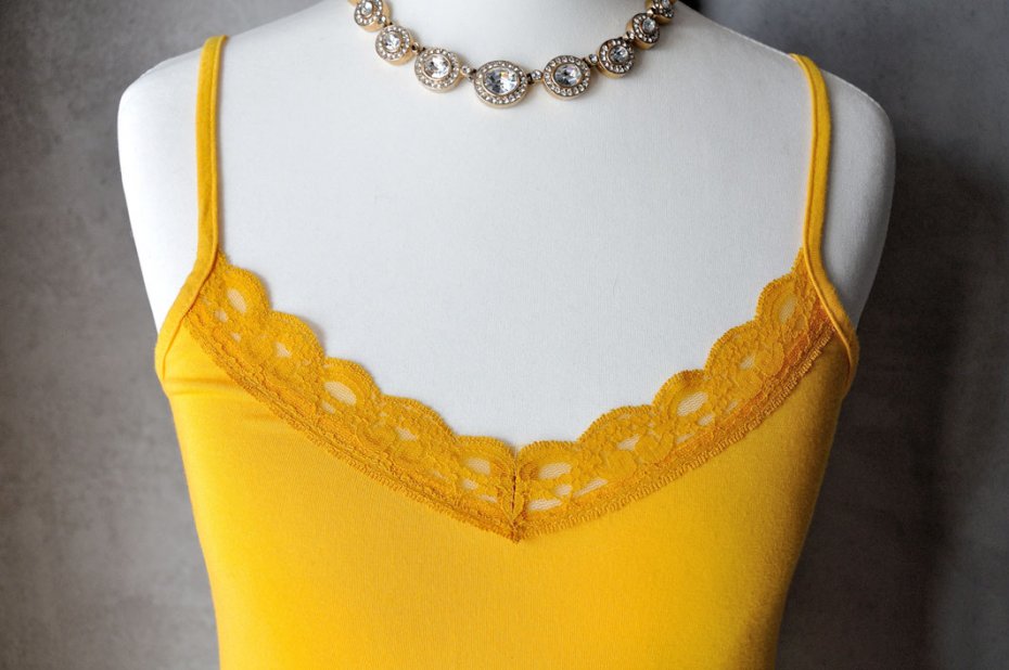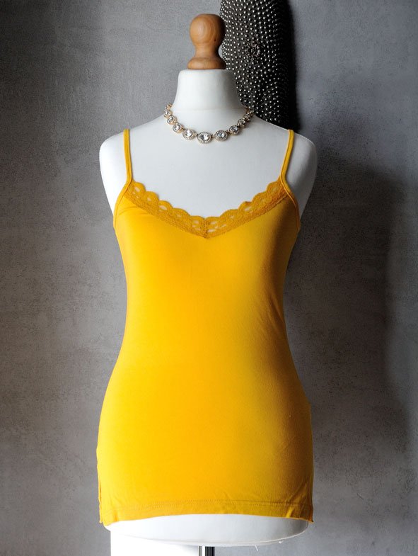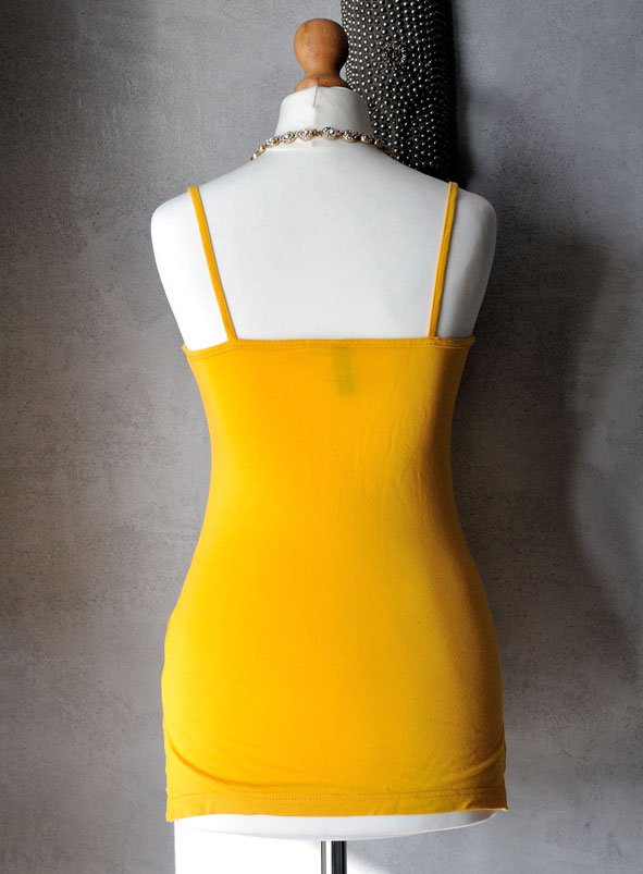 Uszyty z elastycznej, całkiem niezłej jakościowo wiskozy w odcieniu żółtka jajka (ale takiego od kury z wolnego wybiegu :) kolor jest nasycony, "pełny" i wyjątkowo przyjemny w odbiorze; odrobinę wpada w pomarańcz). Produkt Divided by H&M.