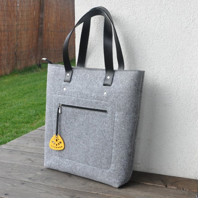 Duża, prosta i funkcjonalna torebka na ramę. Zaprojektowana i uszyta z szarego, grubego i sztywnego filcu jednostronnie impregnowanego. Torebka ta nie będzie się mechacić ponieważ jest uszyta stroną impregnowaną na zewnątrz. Na froncie torebki zamek z przywieszką. Wewnątrz duża przestrzeń. Torebka zamykana na zamek. Rączki z czarnej skóry naturalnej. Całość jest sztywna. Torebka jest bardzo wygodna. Części torebki wycięte laserowo. Mieści format A4 bez problemu.